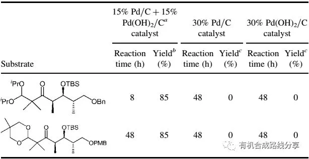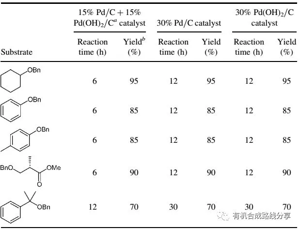 来自美国的Li等人于2006年报道了将等摩尔的Pd(OH)2/C和Pd/C混合脱苄基的例子,从对比试验我们可以看出混合催化剂的脱苄基效率明显高于单独使用Pd(OH)2/C和Pd/C,不管是反应时间缩短方面,还是产率方面都有非常优秀的表现(图2和图3)。因此,大家在实验中遇到单一Pd(OH)2或C和Pd/C难以脱除的例子,可以尝试一下这个催化剂组合。