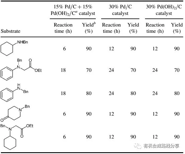 图3:芳基和烷基苄胺脱苄。图片来源:Synthetic Communications