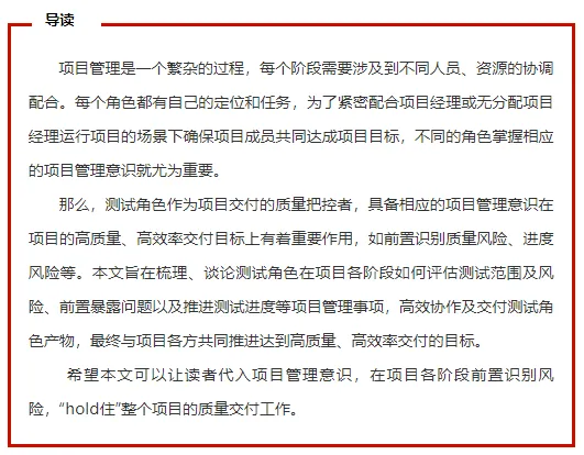 测试经理除了要管理产品线的质量保障和日常部门事务工作外,另一项比较重要的就是测试项目全流程的管理。