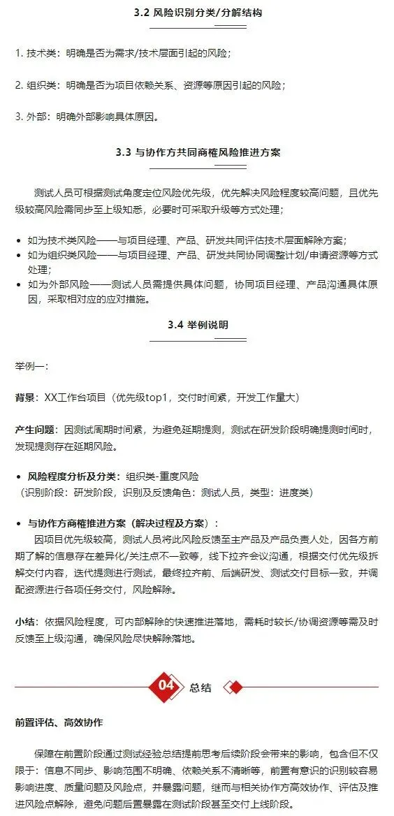 那么风险产生的原因就不重要了吗?当然不是,每一次的项目中产生的问题各不相同,原因也大相径庭。我们无需了解可能产生风险的每一个原因,但当风险产生的时候原因却是解决问题的最终本质。通过一次次的总结与实践,当项目开展的前期我们可以把产生风险的可能原因列出并标明会出现的阶段或时间点,有了预期和准备之后才能在最短的时间内把风险控制在可控范围内;另外每个风险可能产生的情况与后果都需要在项目前期做好明确的说明,哪怕不是很准确也需要做好告警,因为当风险真正出现的时候再来评估风险的影响往往会变得比较的被动,特别是线上回归阶段,测试项目的末期出现风险的成本远远要高于项目前期。最后测试项目中的每个节点也要明确好对应的负责人、具体时间点与阶段性输出物,当出现问题的时候可以用最小的成本快进行问题快速定位与解决响应,也方便在项目结束复盘时通过节点与输出物进行项目质量的判断与评估。