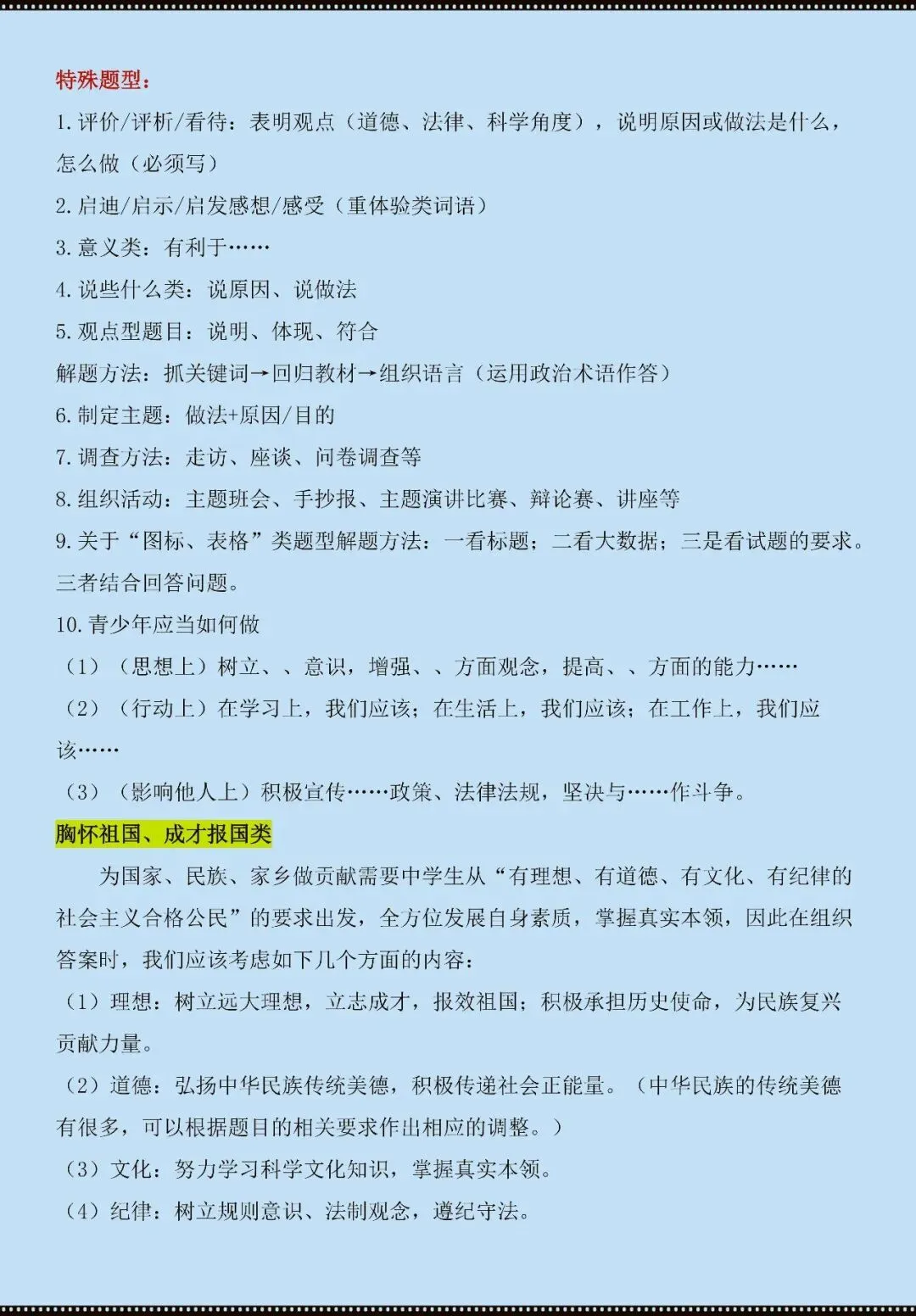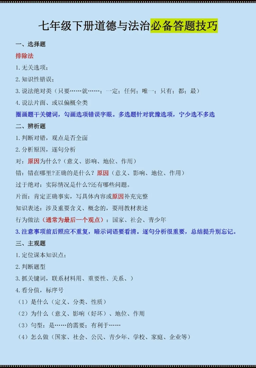 今天老师给大家整理了:七年级下册道德与法治必备答题技巧(电子版可打印)