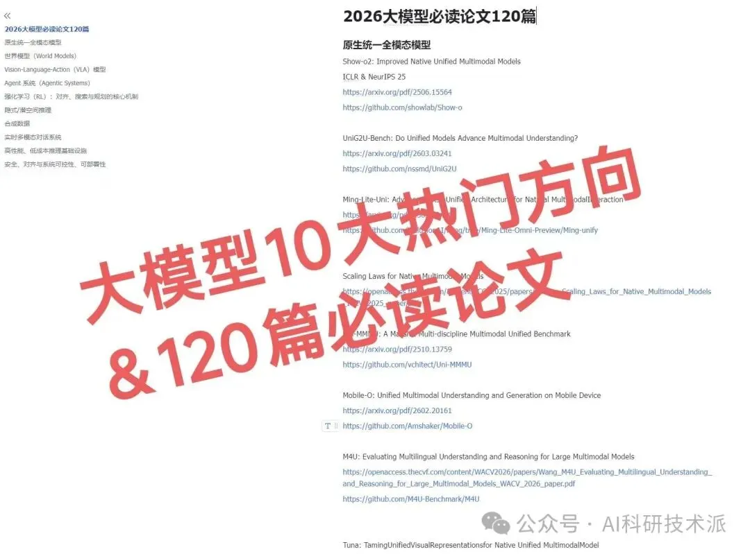为方便大家研究的顺利进行,我给大家整理了目前大模型领域最热门的10大方向,共120篇高质量论文,原文和源码都有。主要涉及:原生统一全模态模型、世界模型、VLM、Agent系统、强化学习、潜在推理、高效推理、安全性和可控性……