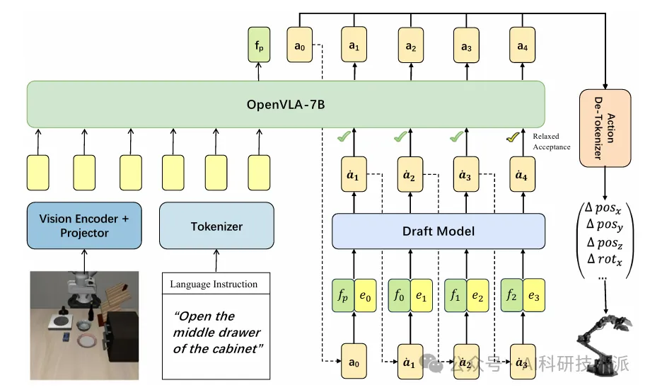 内容:该研究针对视觉 – 语言 – 动作(VLA)模型因视觉语言模型(VLM)参数量大、自回归解码特性导致的高计算成本问题,首次将投机解码(SD)框架适配并改进提出 Spec-VLA,解决了直接应用 SD 于 VLA 动作预测任务提速效果微弱的痛点。研究基于 VLA 模型动作令牌的相对距离设计了松弛接受机制,有效提升了令牌接受长度,在多个测试场景的实验结果表明,该框架相较 Open VLA 基线模型将接受长度提升 44%,实现了 1.42 倍的推理加速,且完全不损失任务成功率,验证了投机执行在 VLA 动作预测场景的广泛应用潜力,相关代码等研究产物遵循 Apache 协议开源并完成了规范的实验统计与文档说明。