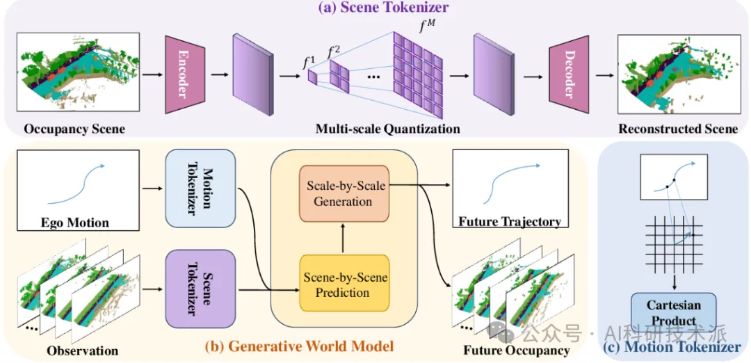 内容:该论文提出了面向自动驾驶的 3D 占用世界模型 OccTENS,针对现有自回归占用模型存在的推理低效、长时生成时序退化和缺乏位姿可控性问题,将占用世界模型重构为时间下一尺度预测(TENS)任务,把时序序列建模拆解为空间逐层生成和时间逐帧预测,设计了 TensFormer 架构实现对占用序列时间因果性和空间关联性的灵活高效建模,并提出整体位姿聚合策略,将车辆自运动与占用信息统一序列建模,同时实现位姿可控的占用生成和自动驾驶运动规划。模型由多尺度场景分词器、运动分词器和生成式世界模型构成,通过解耦帧回归与尺度回归、分离尺度级时间因果注意力和帧级空间注意力,解决了多尺度时序建模的注意力过载问题。在 nuScenes 数据集的实验表明,OccTENS 在 4D 占用预测任务中大幅超越 OccWorld、OccLLaMA 等 SOTA 方法,基于真值占用输入的平均 mIoU 达 22.06%、IoU 达 31.03%,运动规划的长期预测表现更优,且 2 尺度版本推理速度快于 OccWorld,6 尺度版本在性能和效率间实现最优权衡,同时能精准根据给定位姿生成匹配的占用场景,为自动驾驶实时应用提供了高性能、可控制、高效率的 3D 占用世界模型方案。