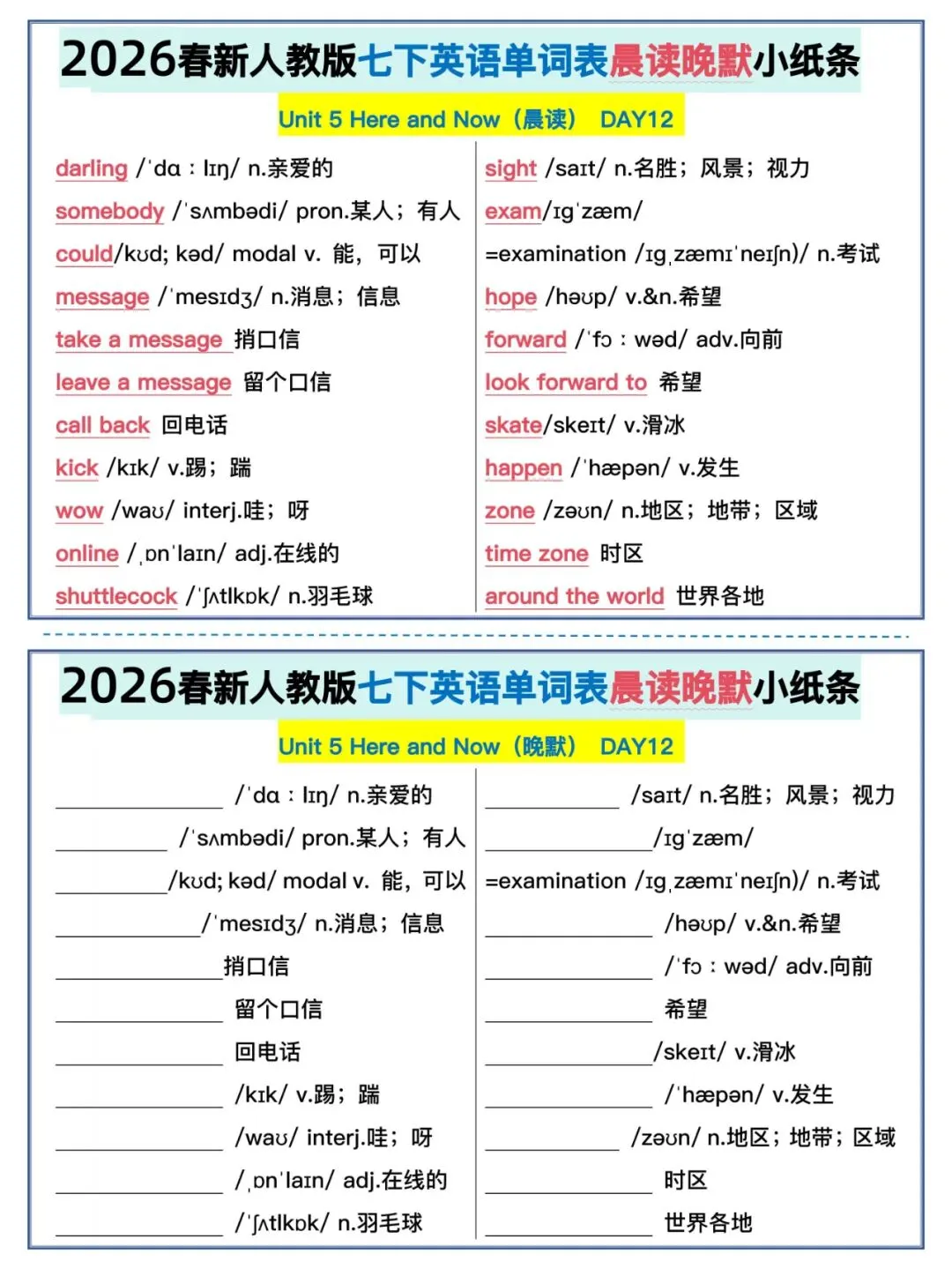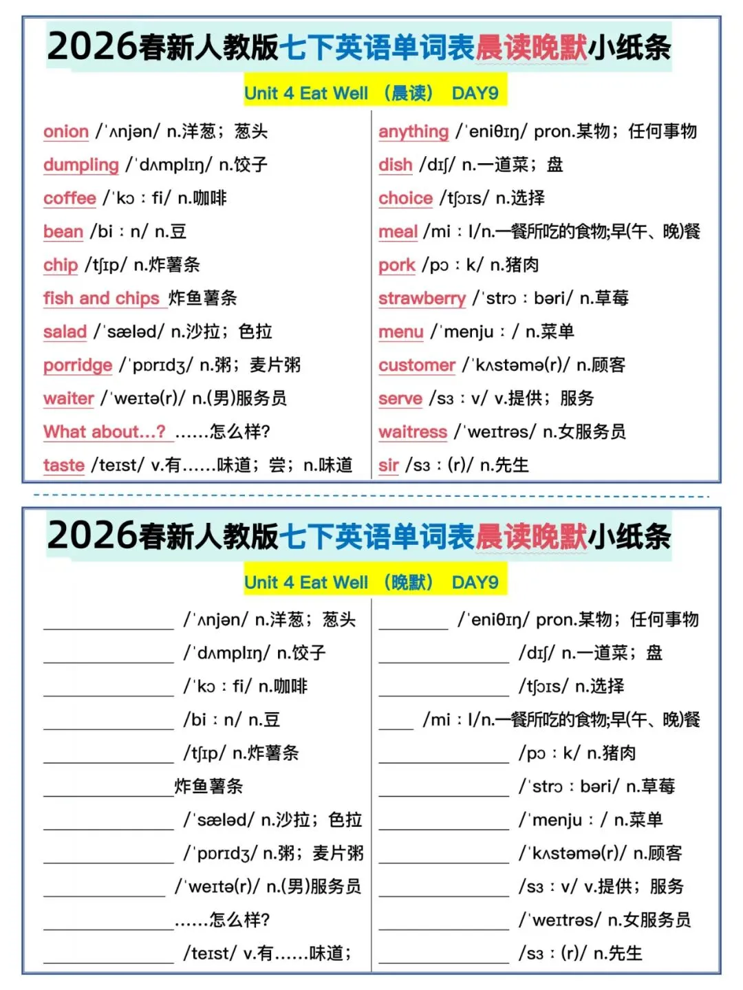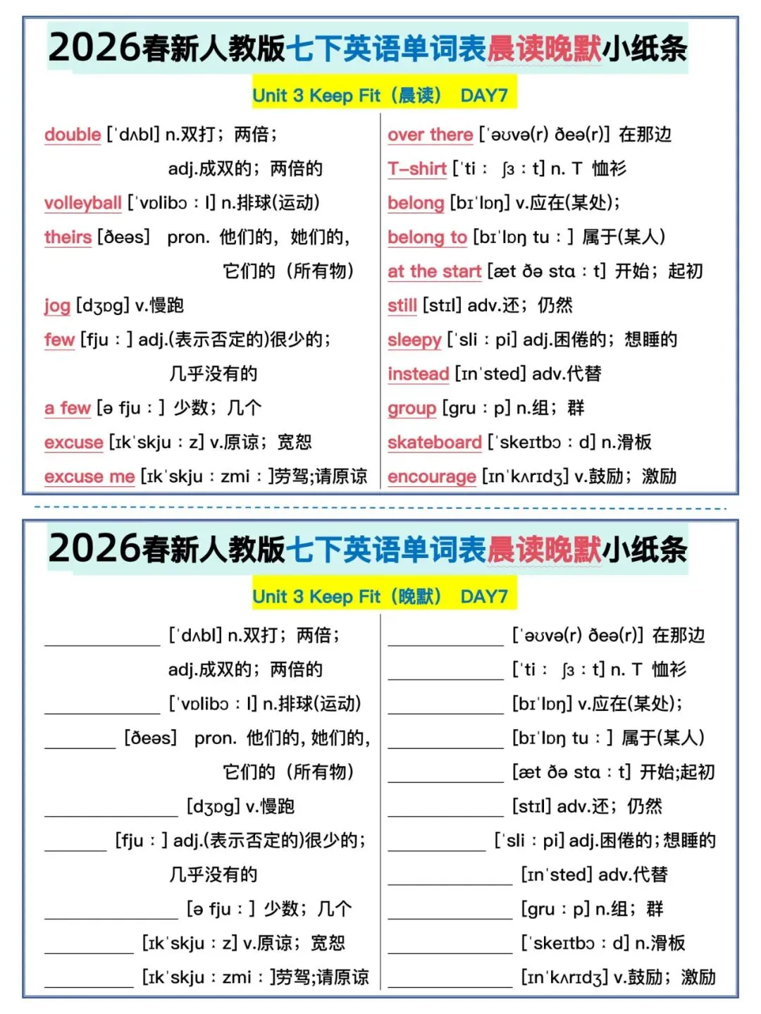 七年级下册英语单词晨读晚默小纸条电子版可打印