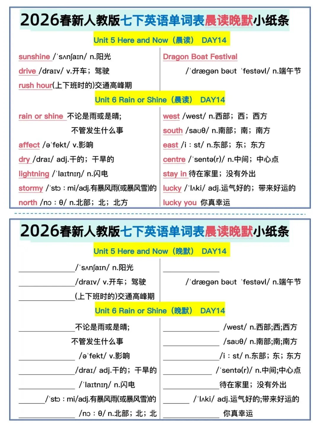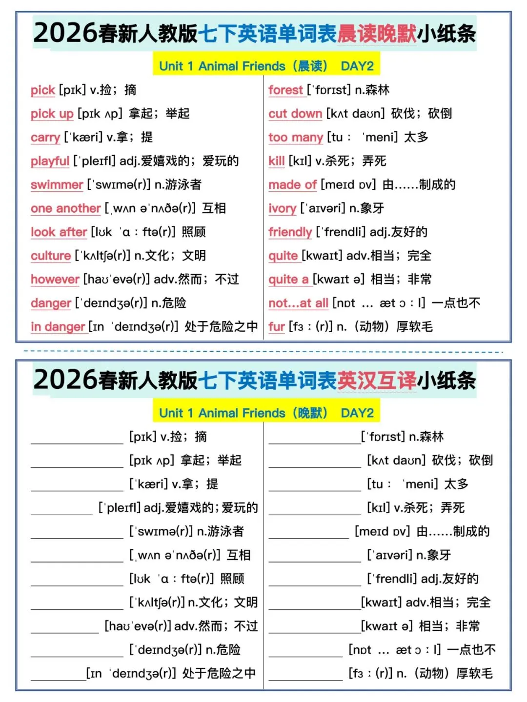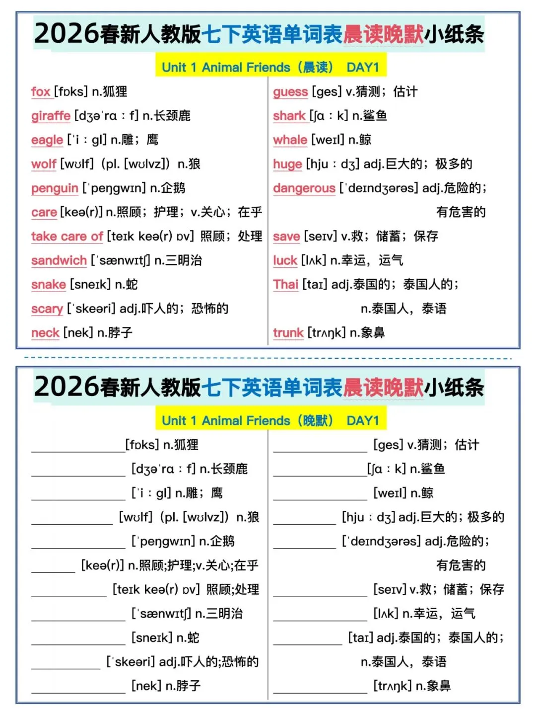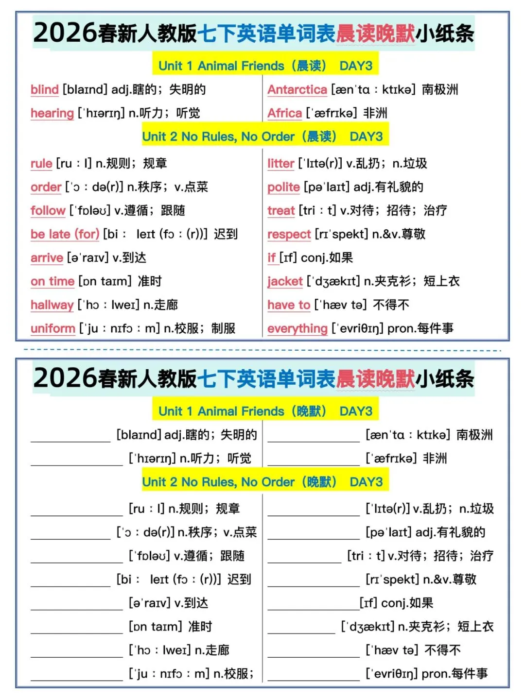 七年级下册英语单词晨读晚默小纸条电子版可打印