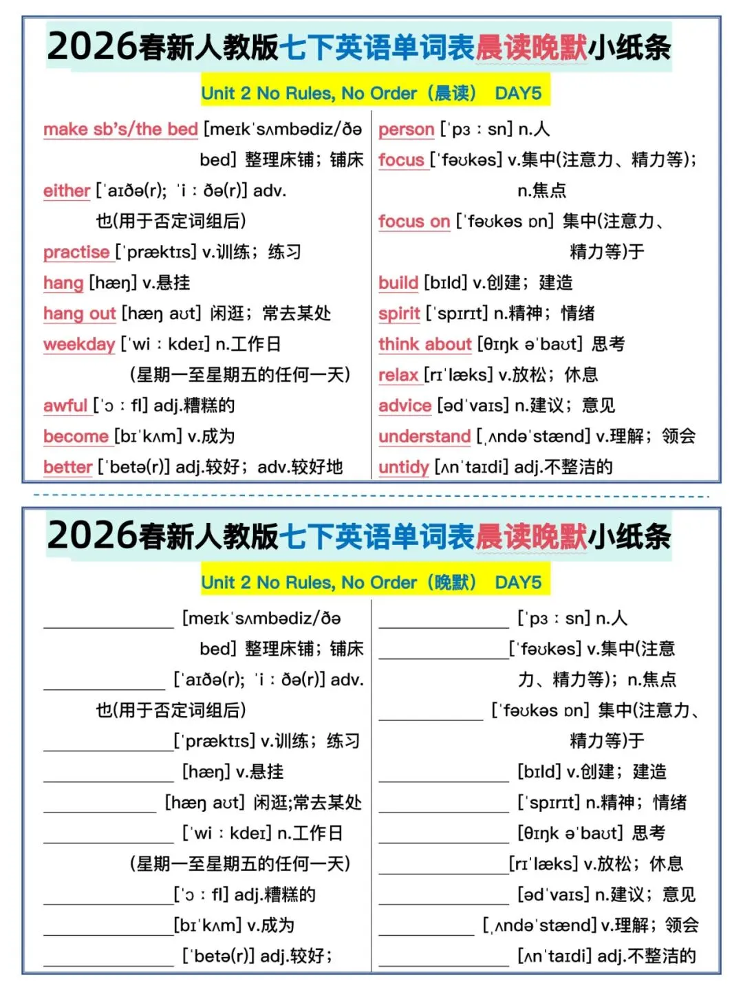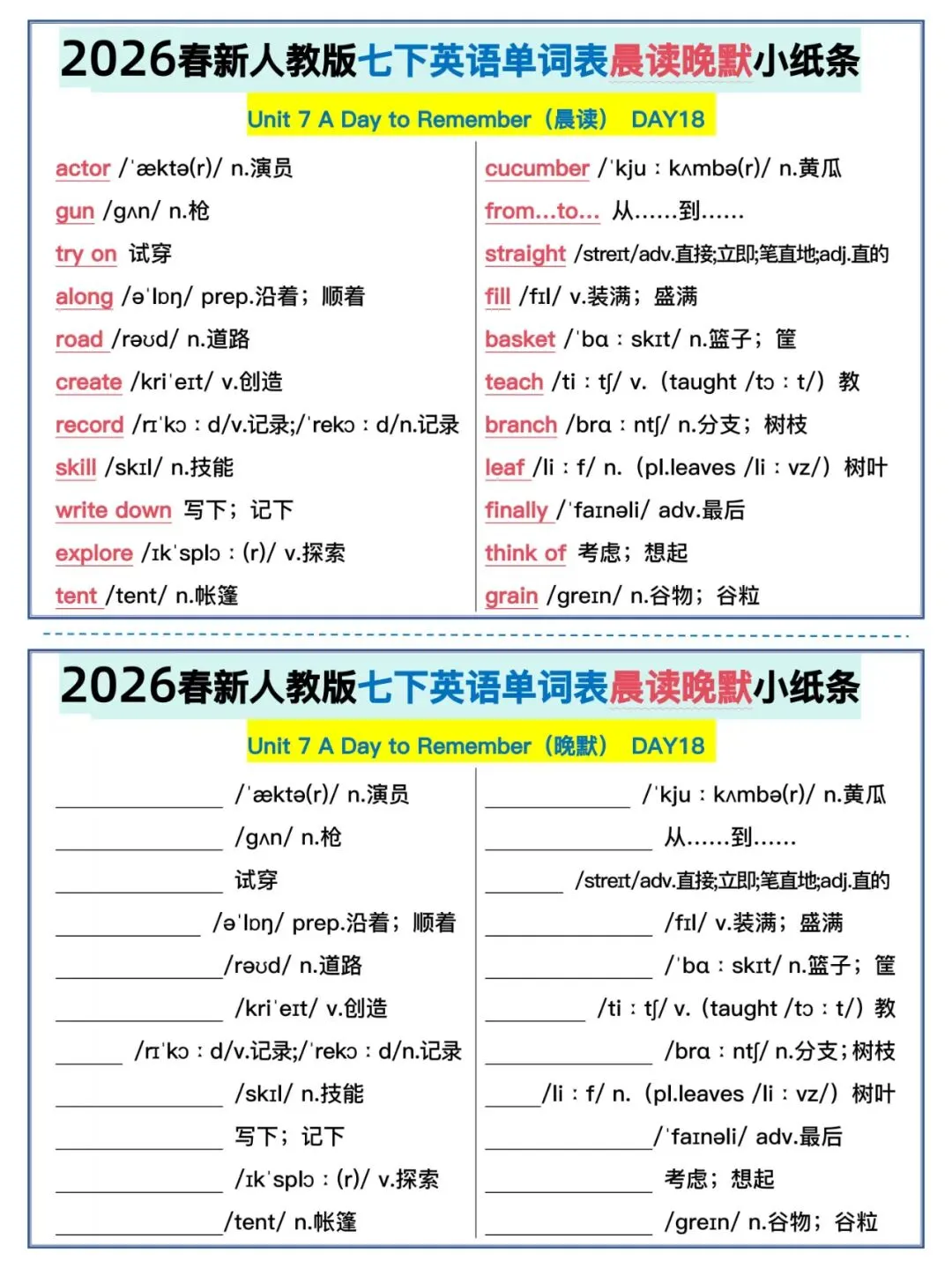 今日老师为大家整理了:七年级下册英语单词晨读晚默小纸条电子版可打印