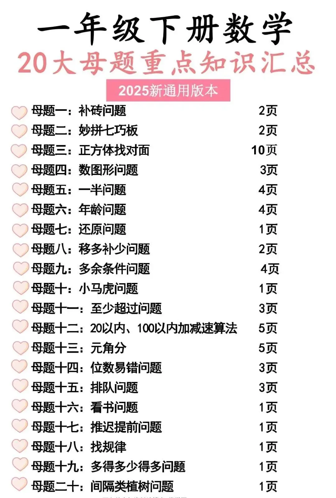 一下数学20大母题重点知识汇总(电子版) 今天给大家分享的是一下数学20大母题重点知识汇总,涵盖计算、应用、几何、逻辑等高频考点,每道母题搭配清晰解题思路、标准步骤与易错点提醒,孩子一看就懂、一学就会。 内容截图预览 限时免费领取: (公众号发文24小时内) 公众号对话框中发送关键字:23905