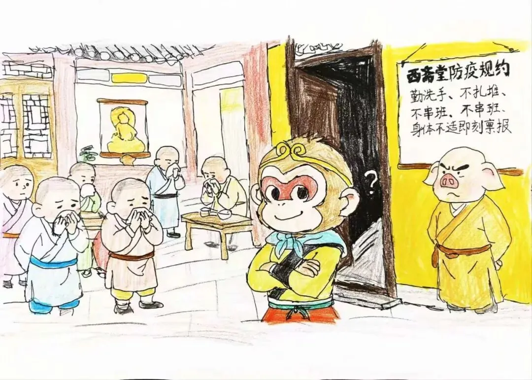 痊愈返校后,悟空主动向师父、同窗道歉,从此严格遵守书院规定:勤洗手、不串班、不扎堆、多喝水。他还亲手书写防疫格言牌,向大家宣讲: