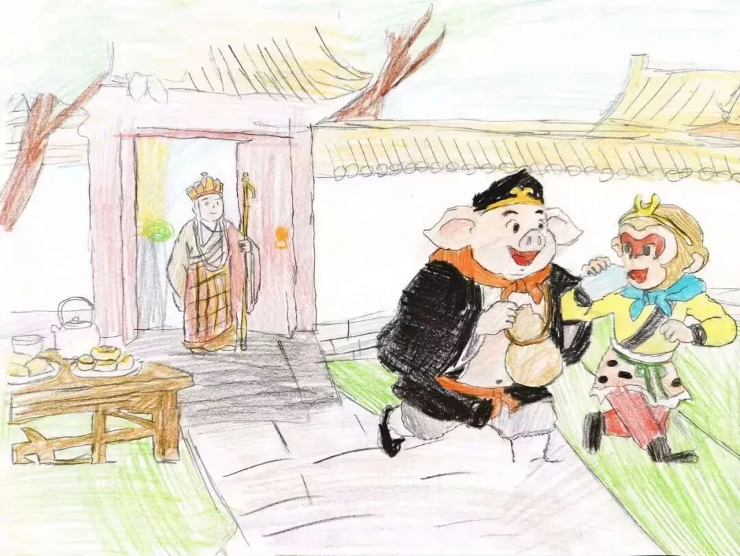 悟空趁师父不备,偷偷溜出本斋,找到八戒一同在庭院追逐喧闹、近距离扎堆说笑,饭前不洗手、共用一个水囊饮水、抓取案上糕点直接入口,把书院规约与名医古训全都抛在脑后。八戒胆小想劝阻,却被悟空一把拉走。