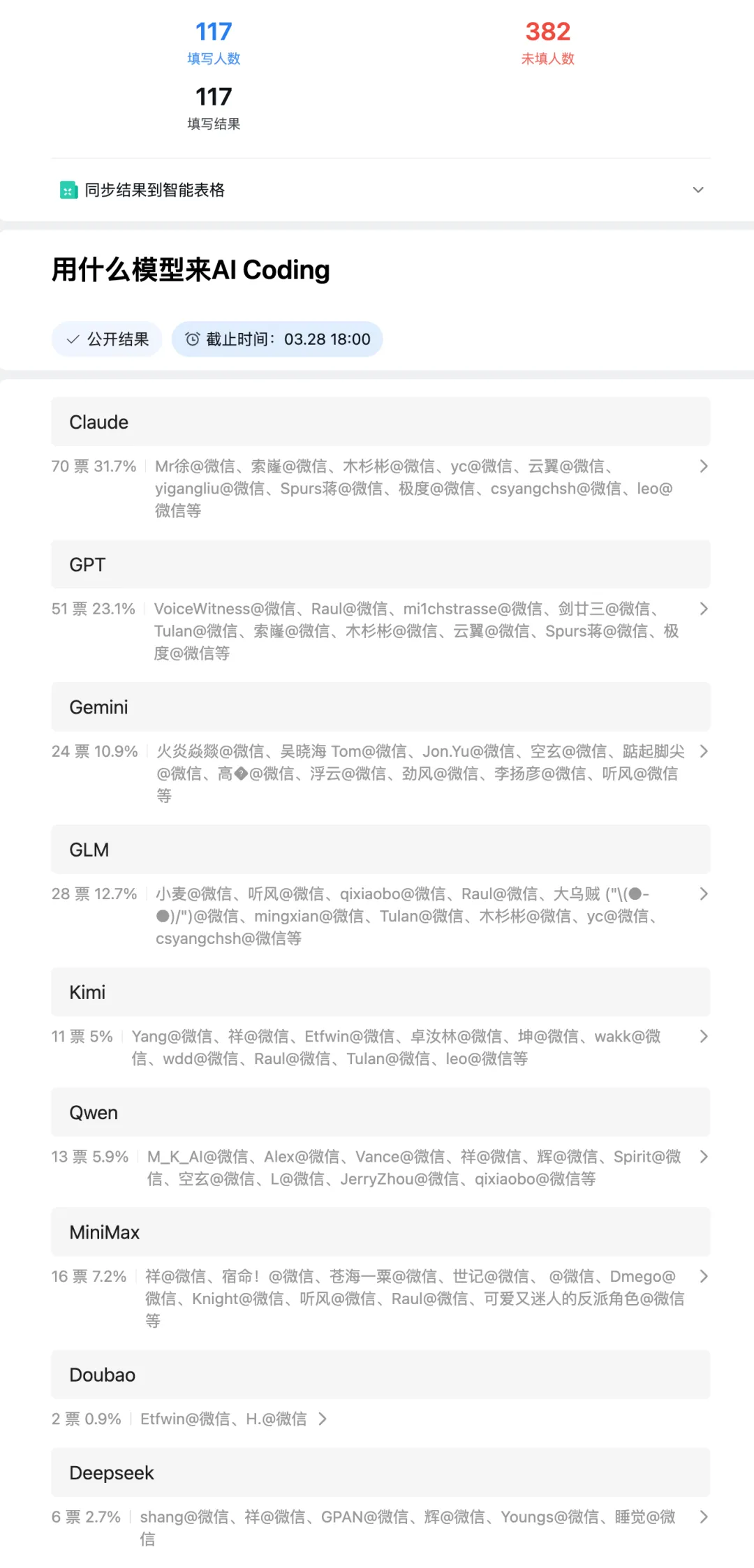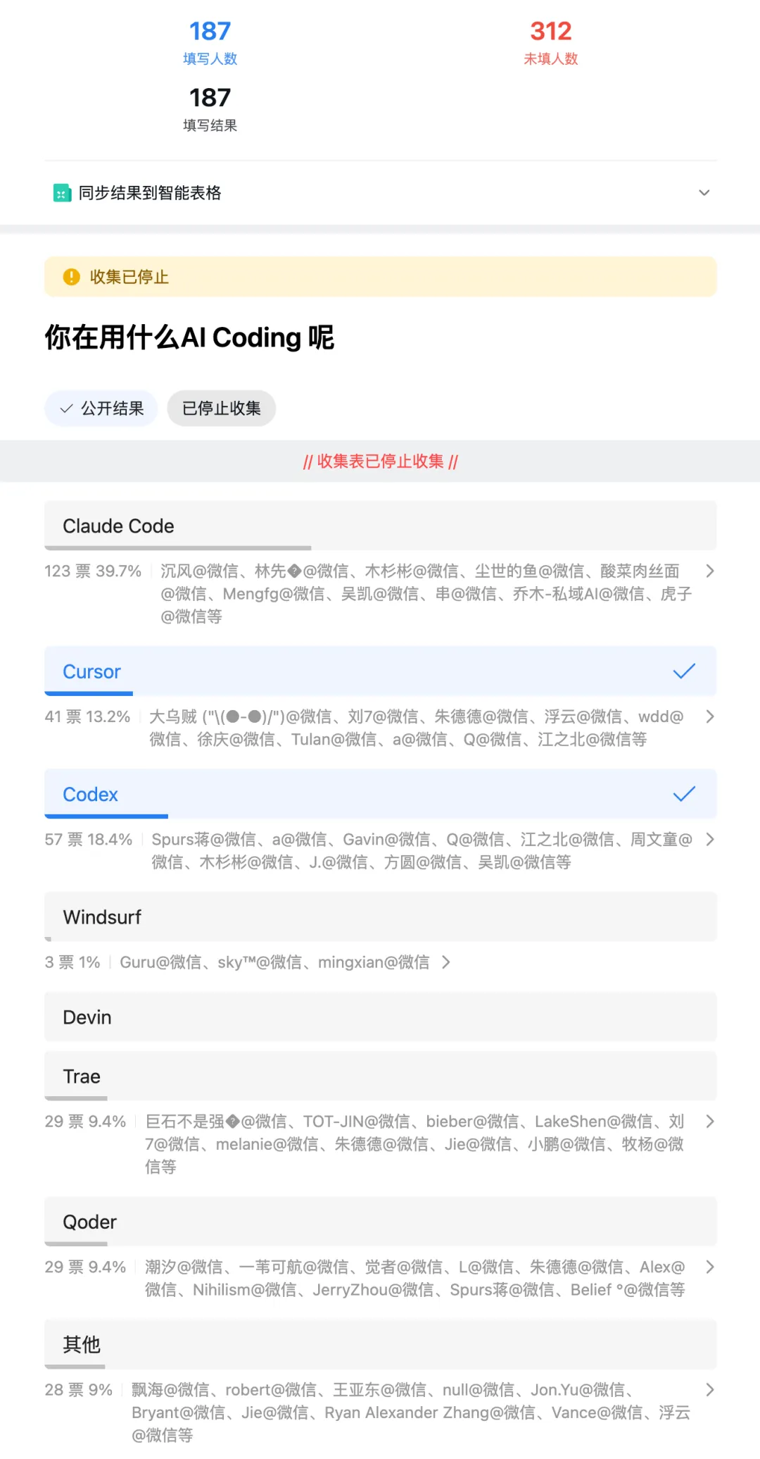 AI Coding 微信群关于工具和模型的两份投票 我觉得还是有一定代表性的,公布给大家看看,一个是关于AI Coding 工具的选择,一个是关于AI Coding 模型的选择,我的建议是,一定要用最好的(或者至少感受过最好的),才能真正的知道现在AI能力的边界,否则认知上可能会有很大的偏差。