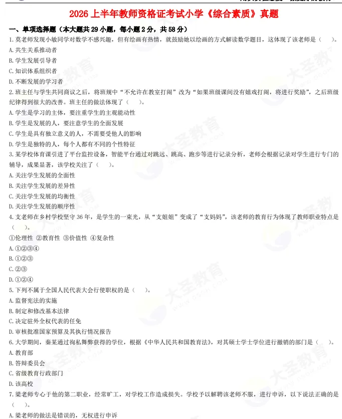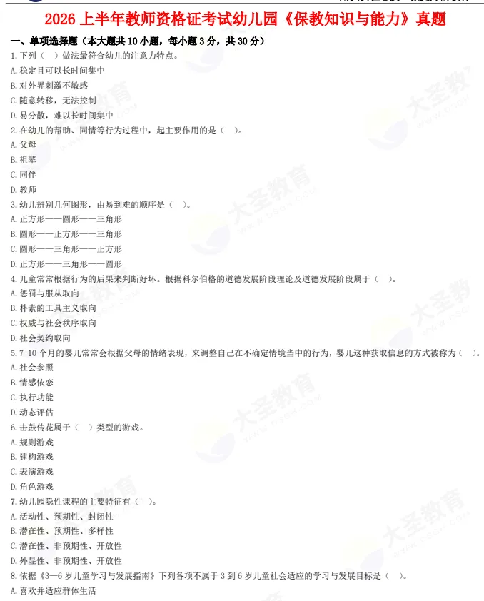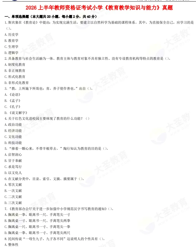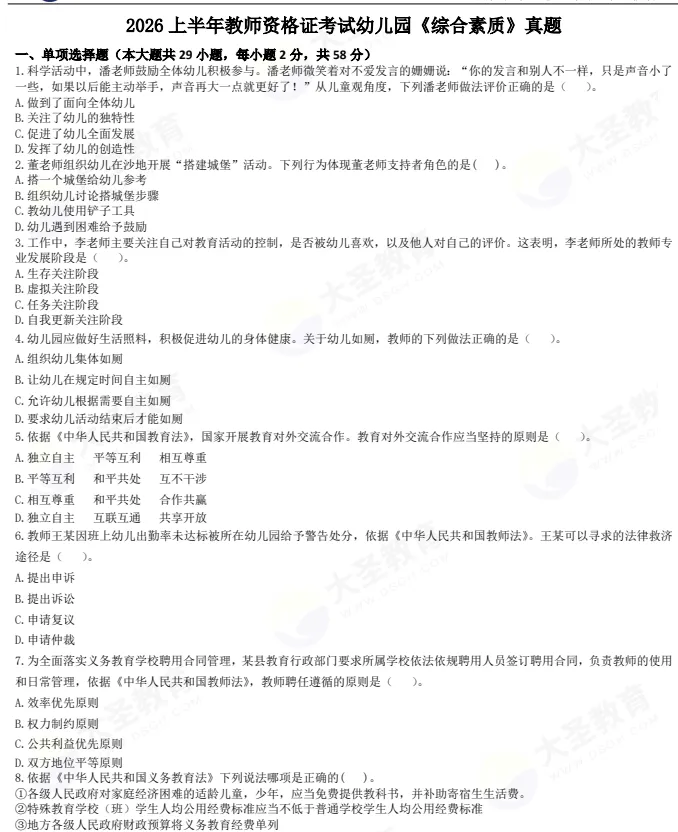 2026教资笔试试题+答案解析完整版合集(中学、小学、幼儿园)含科三,PDF
