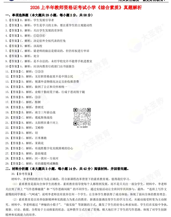 2026教资真题+答案解析完整版汇总(中学、小学、幼儿园)含科三,PDF电子版