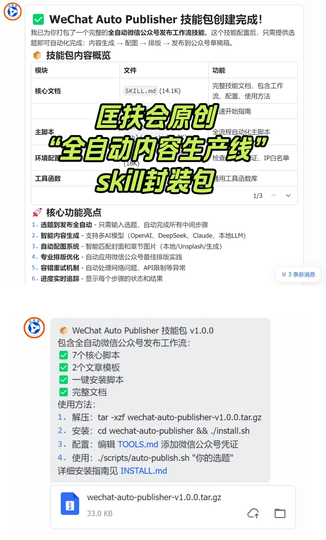 简单来说,就是我们写了一套“全自动、公众号内容生产流水线“的skill,就下面这个东西,大家看一眼,我们自己写的,你拿到手,扔给openclaw🦞,它就自动运行了。👇️