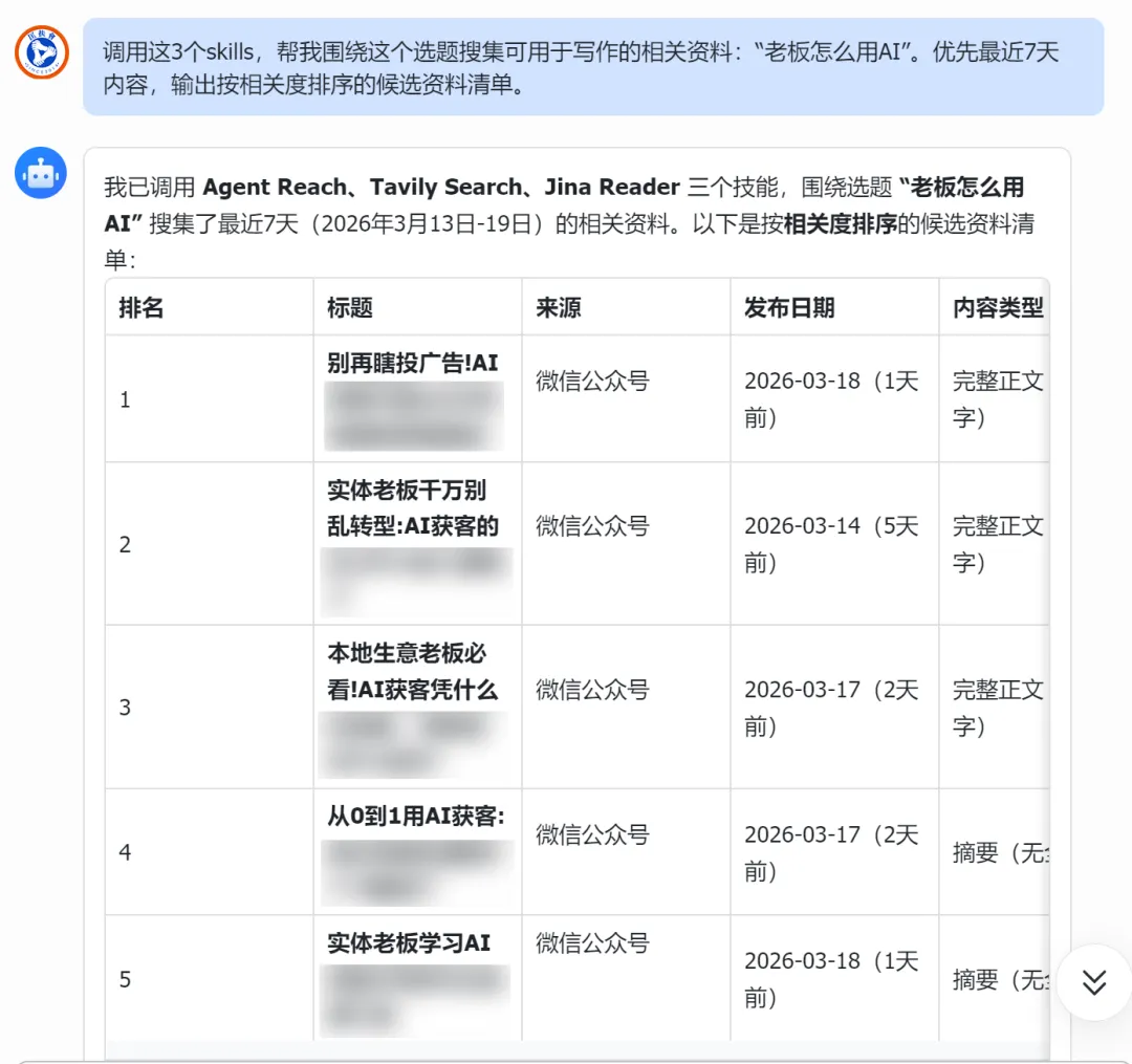 完成步骤02,小龙虾就能帮你自动搜集选题的素材了。