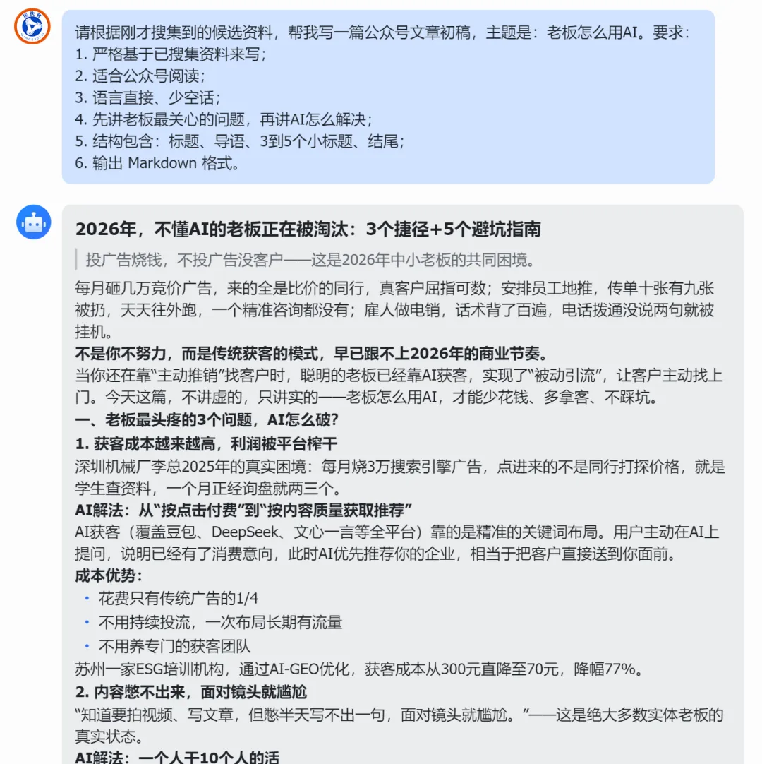 请根据刚才搜集到的候选资料,帮我写一篇公众号文章初稿,主题是:老板怎么用AI。要求: