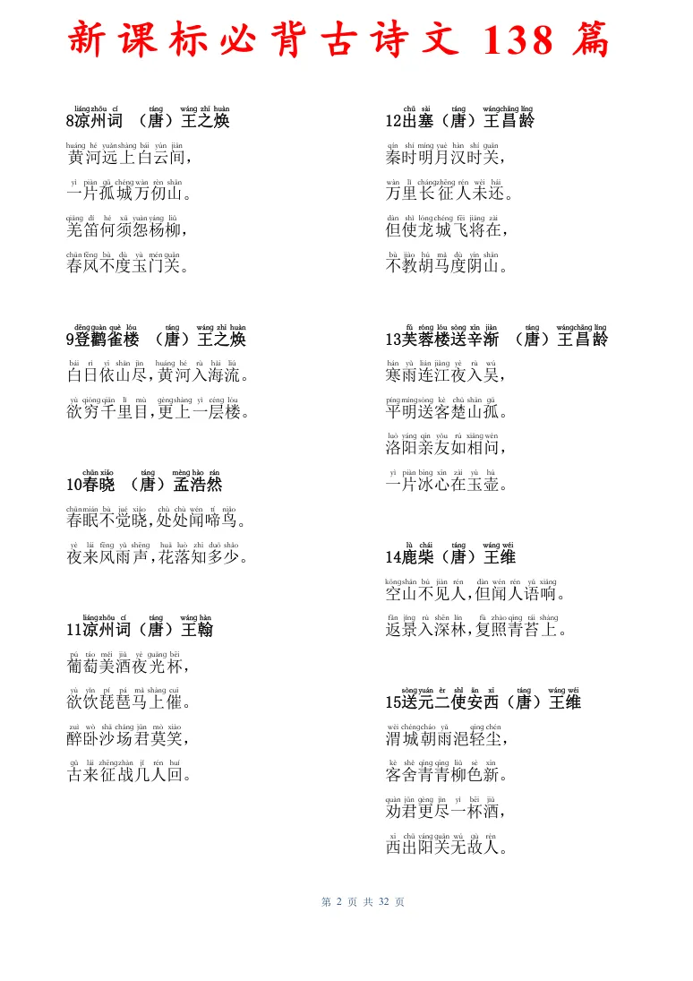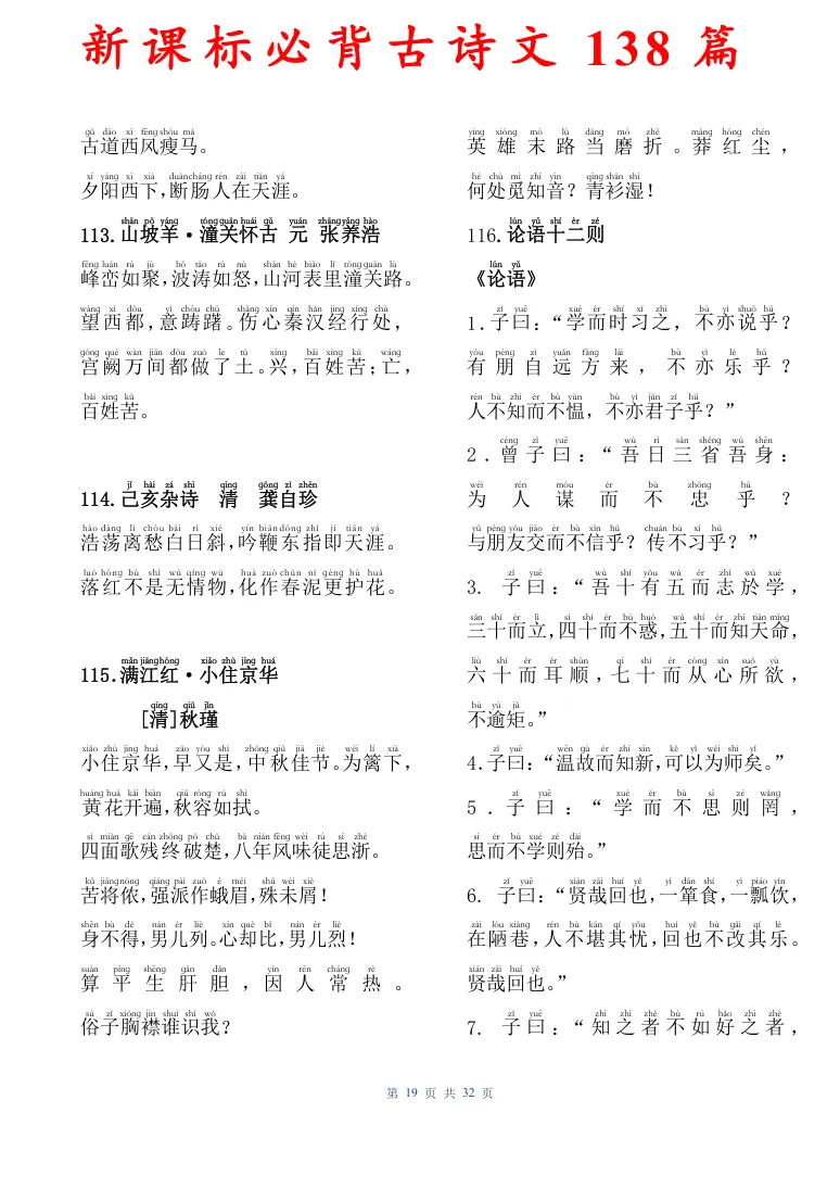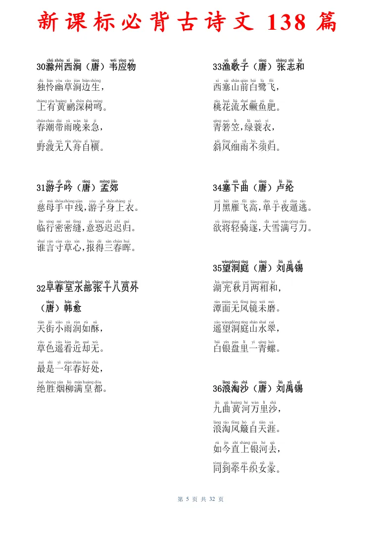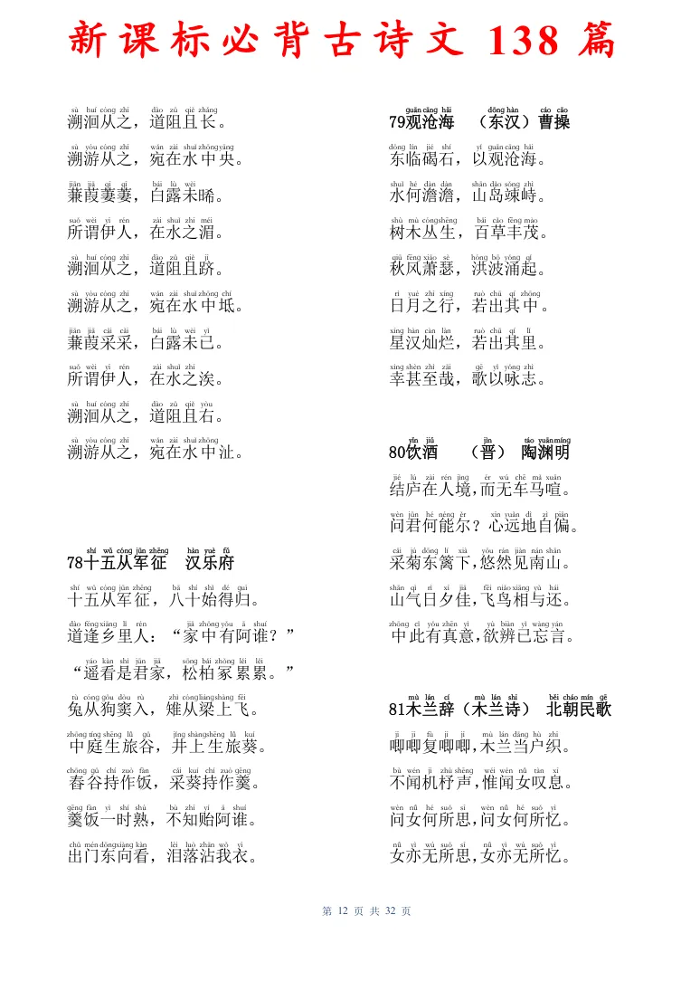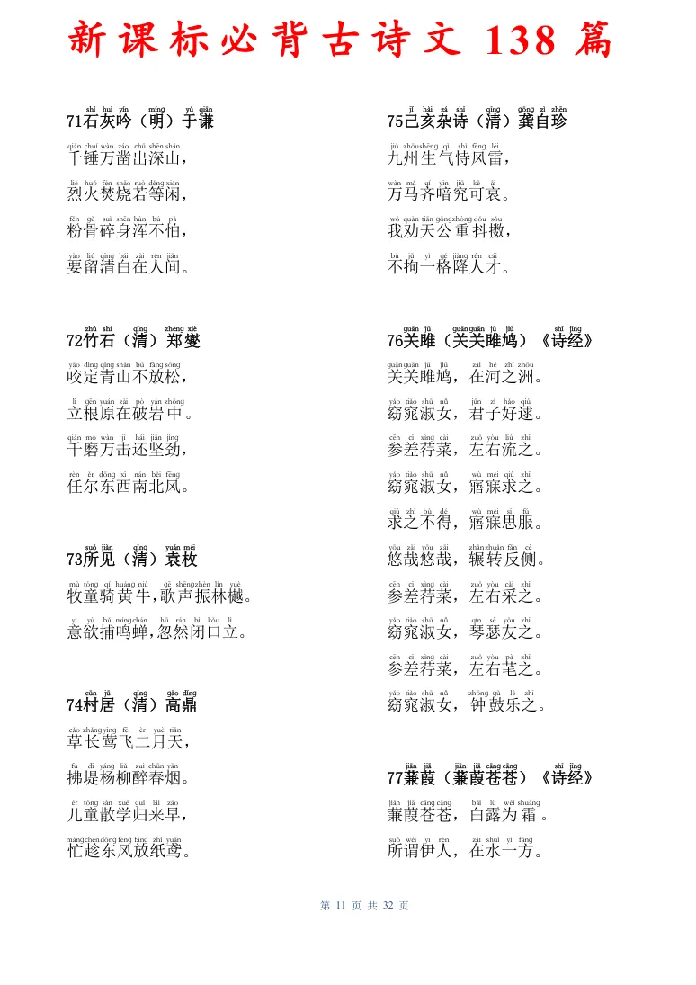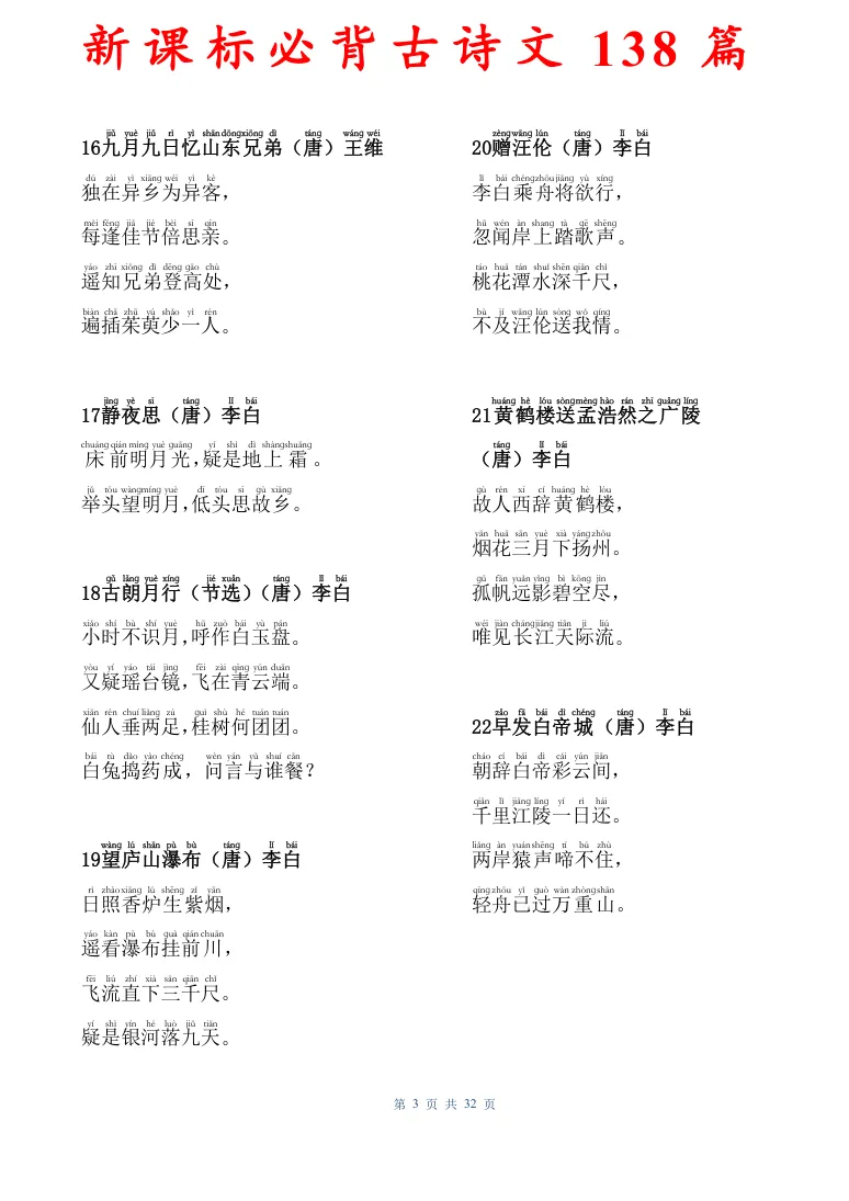 新课标必背古诗文138篇,有电子版可打印