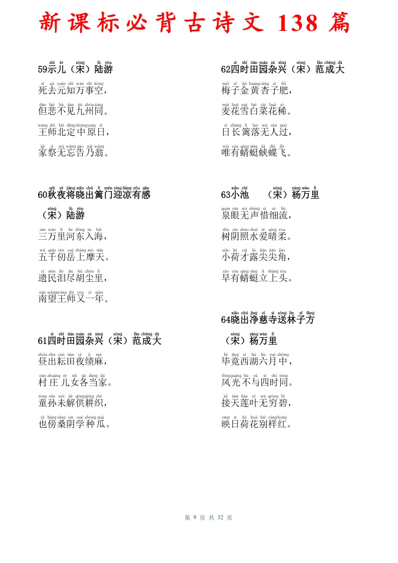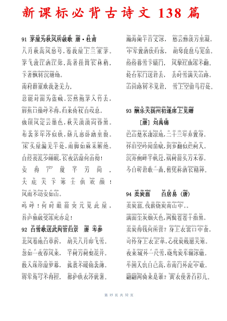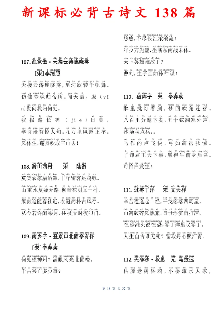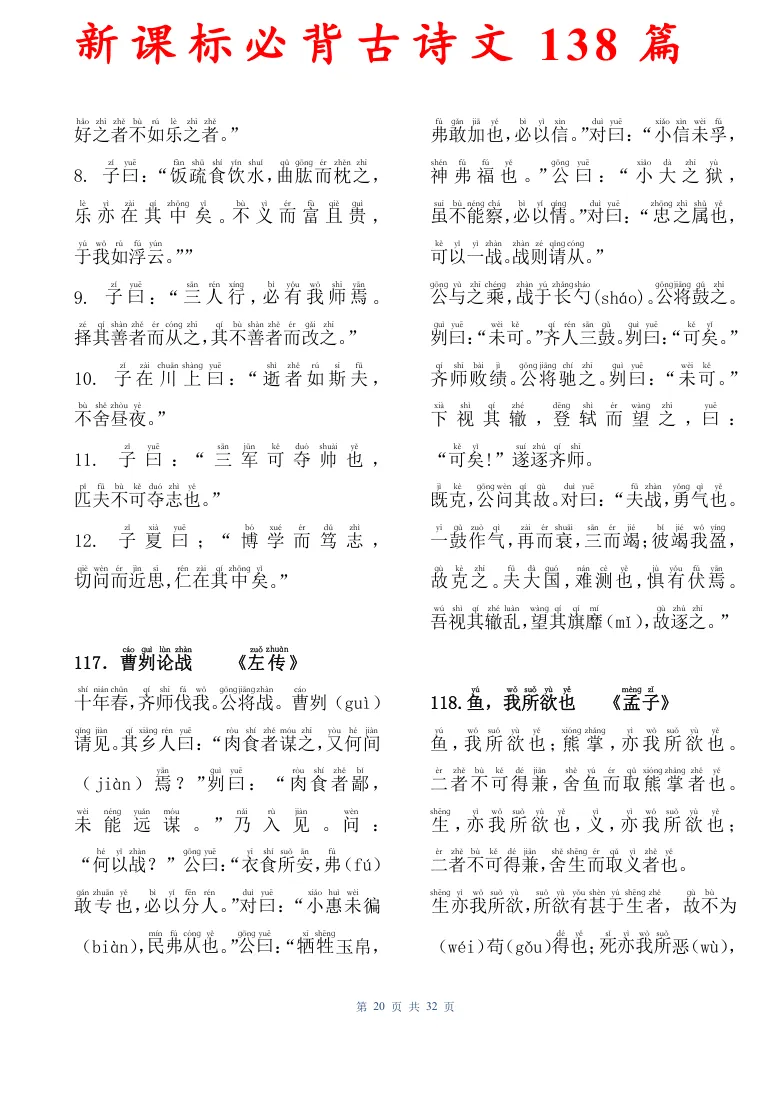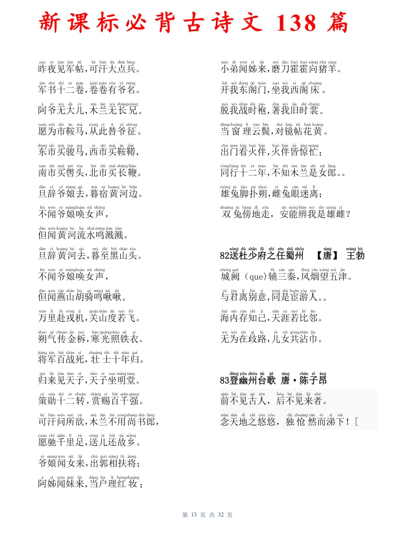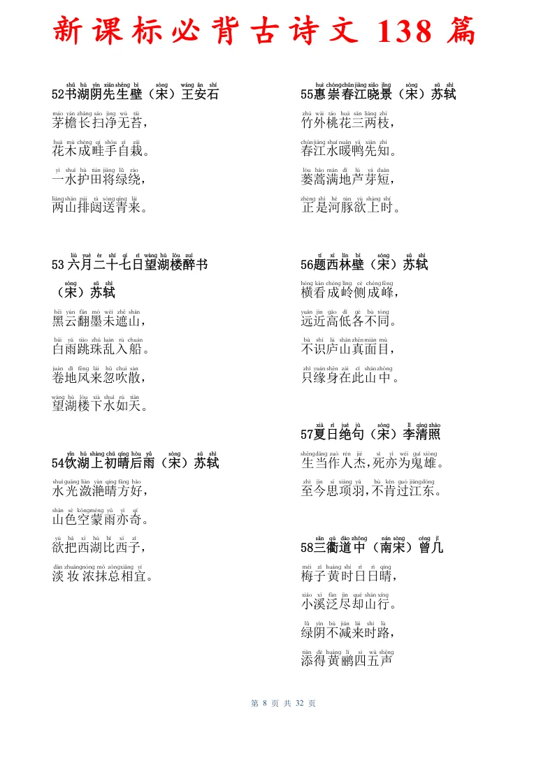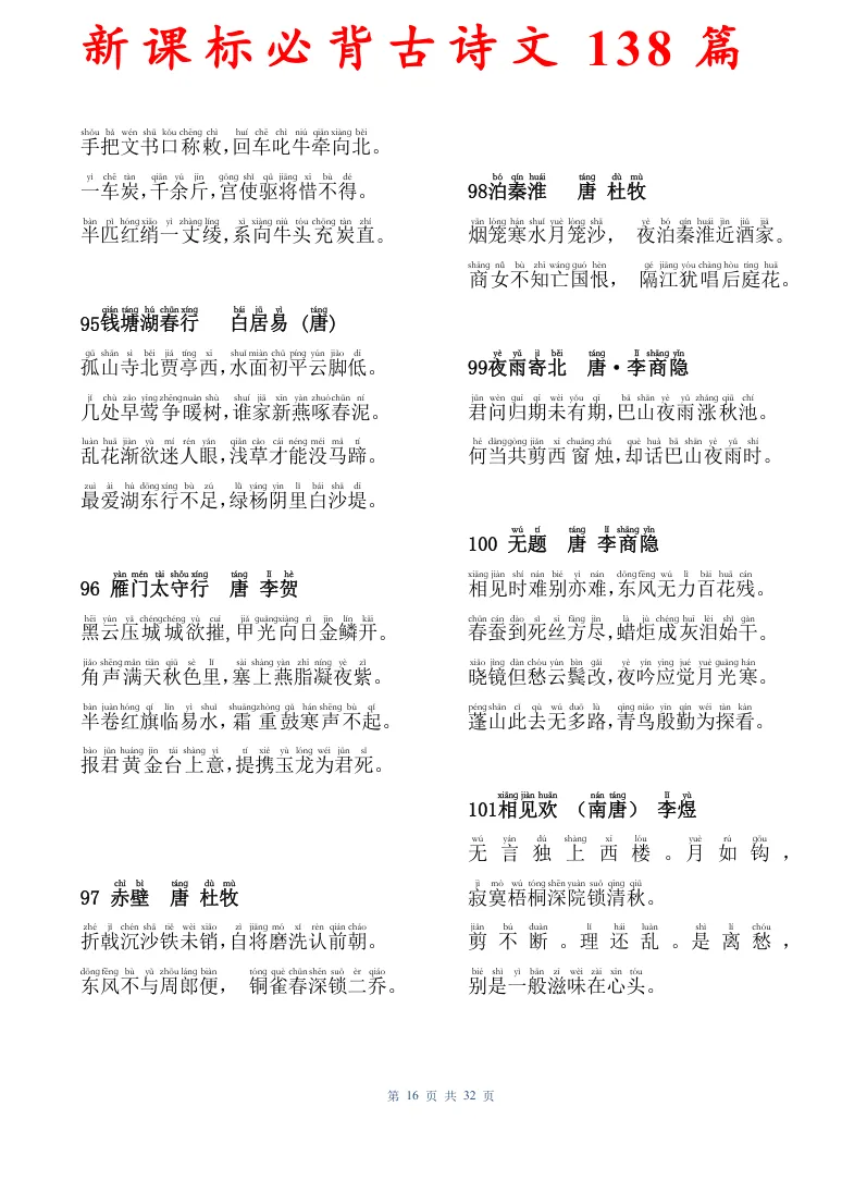 新课标必背古诗文138篇,有电子版可打印