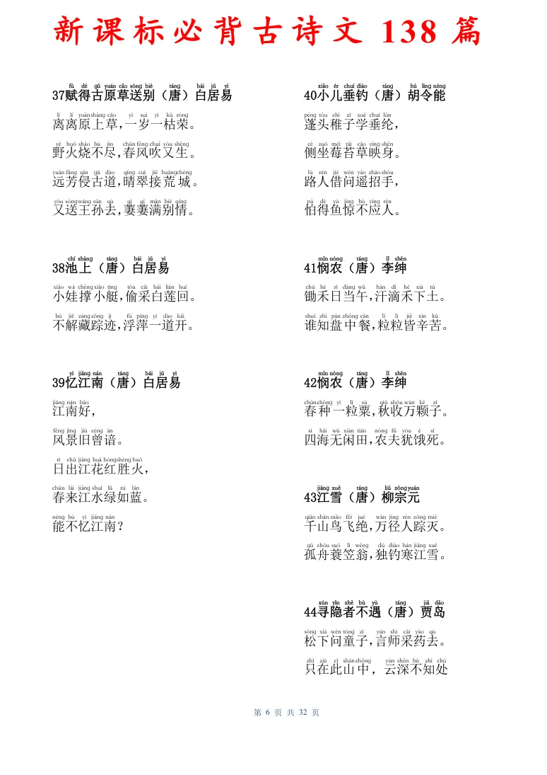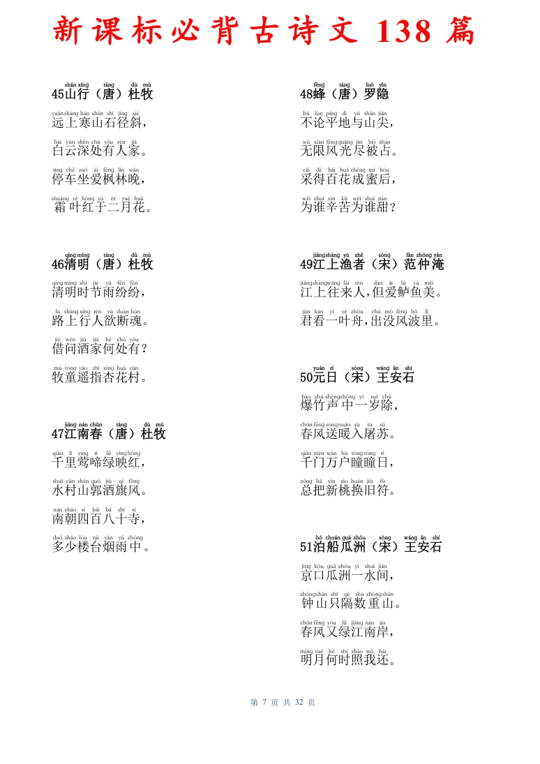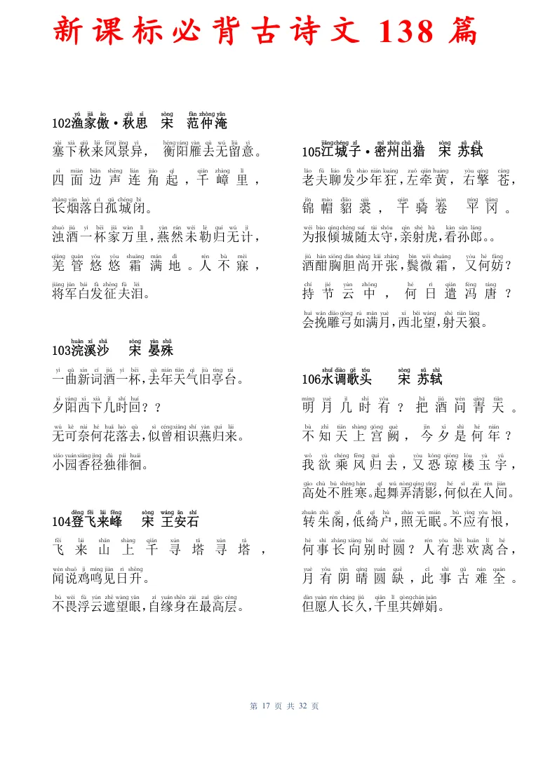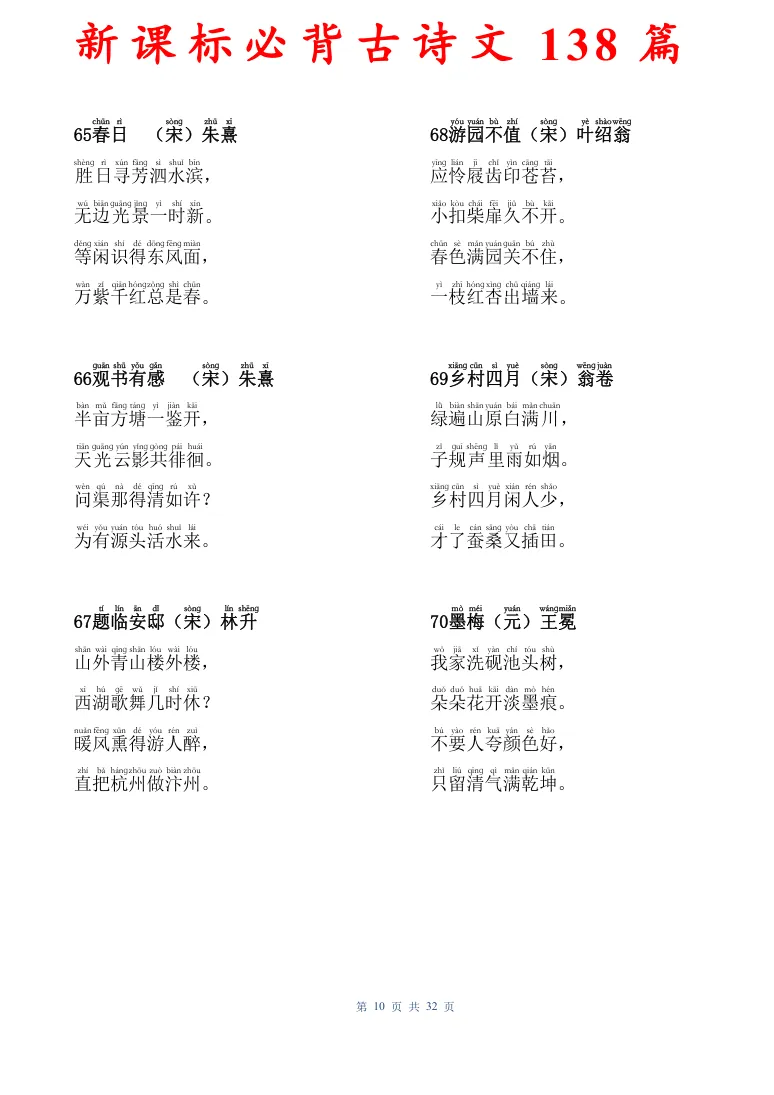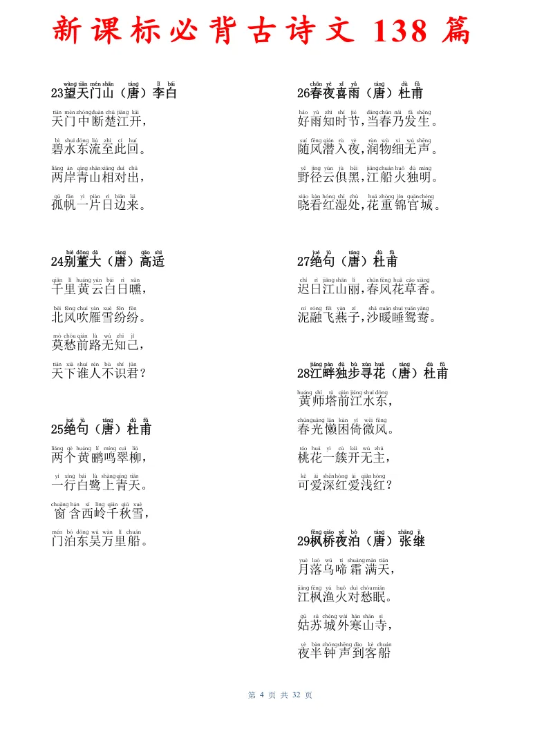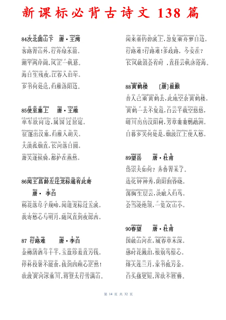 新课标必背古诗文138篇,有电子版可打印