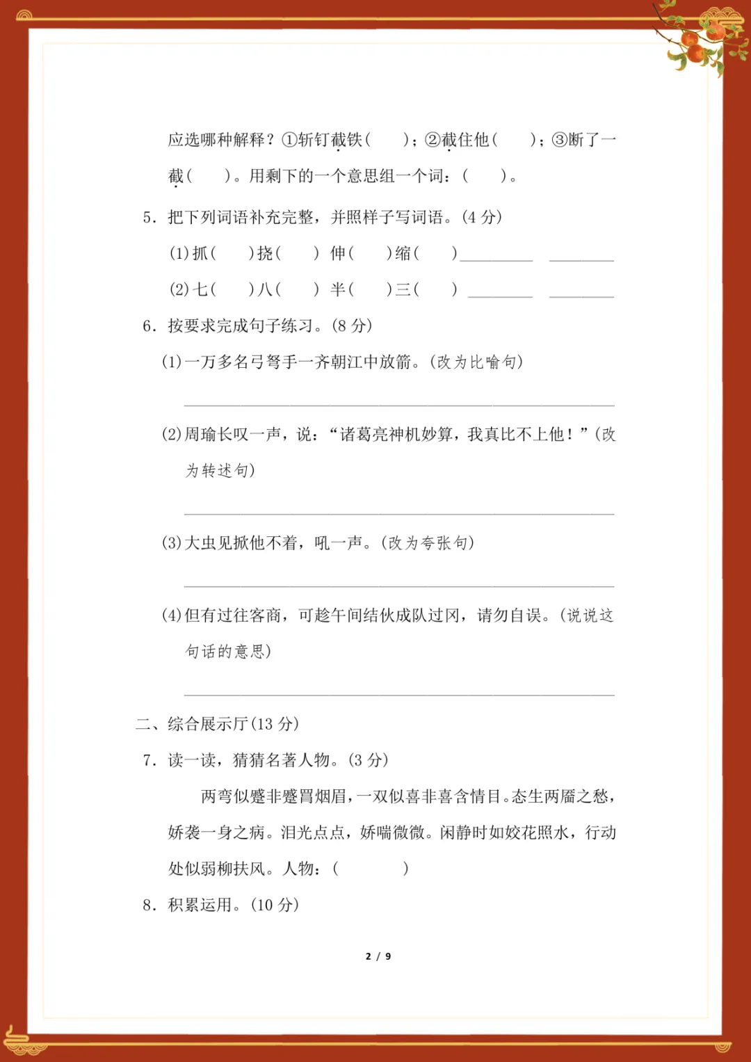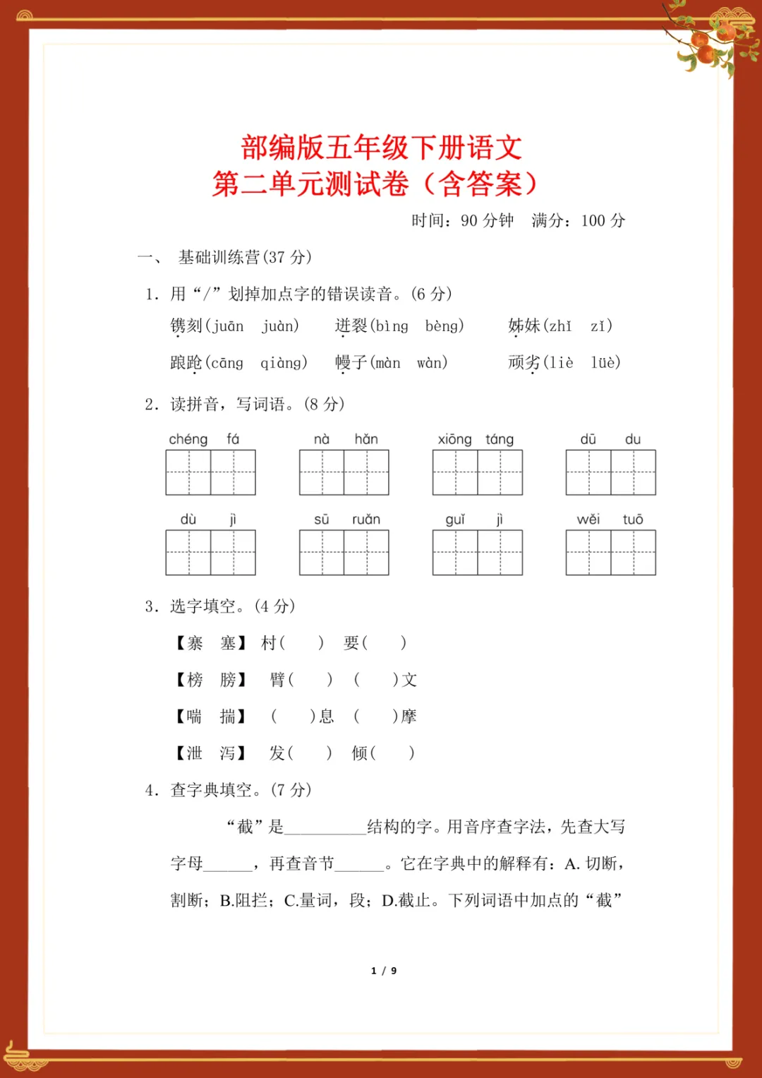 部编版五年级下册语文第二单元测试卷(含答案)电子版可下载