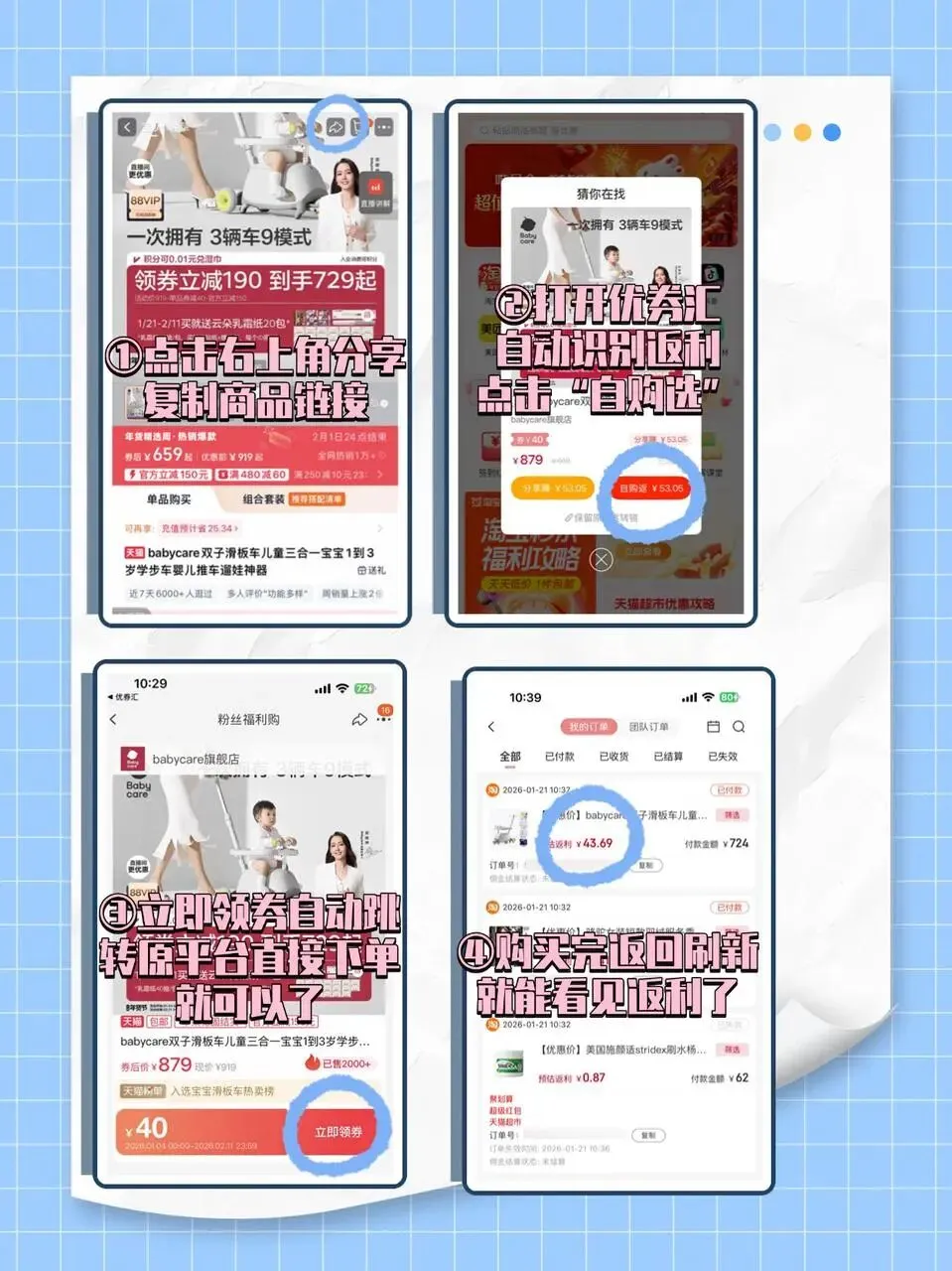 我的操作流程:复制链接→打开优券汇→自动识别并显示返利→领券+跳转下单