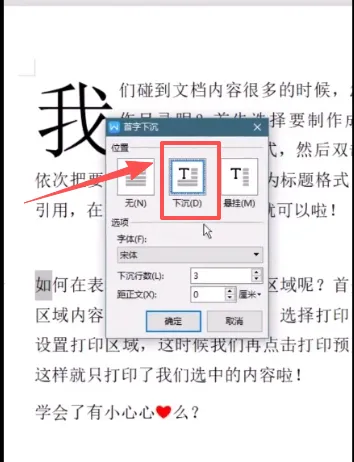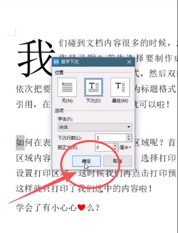 5、选择下沉选项后,还可以选择下沉行数以及字体。点击确定就OK了。