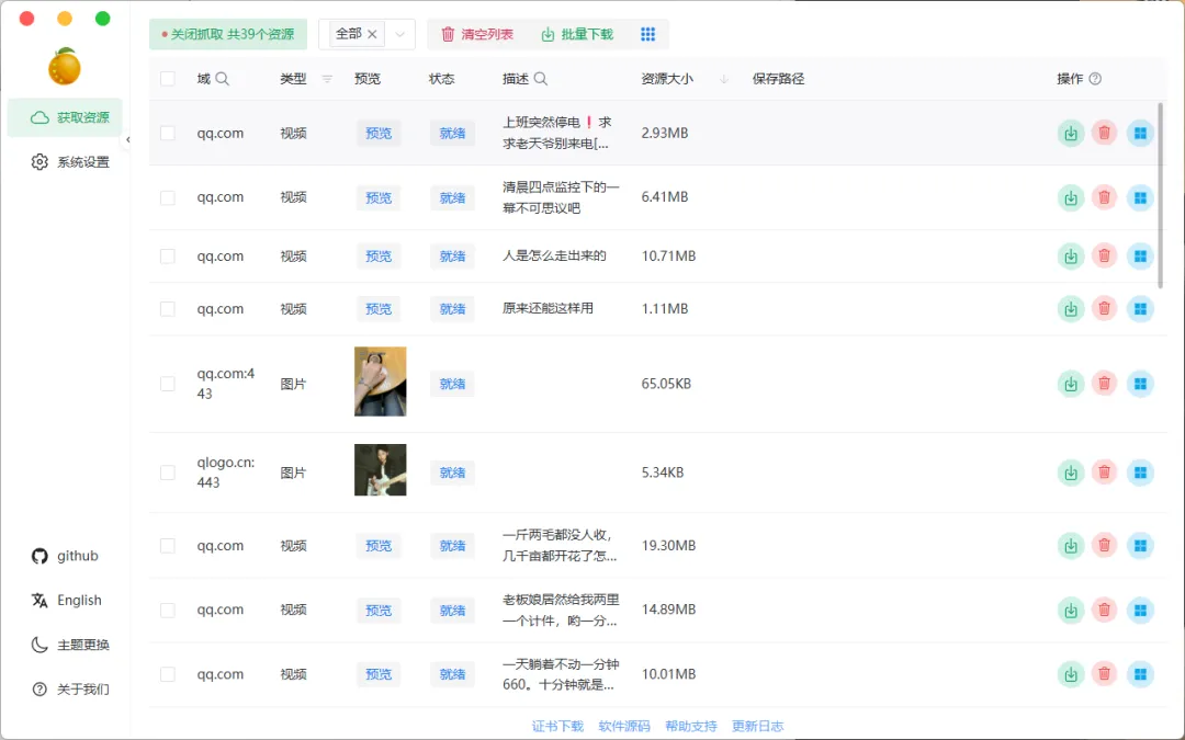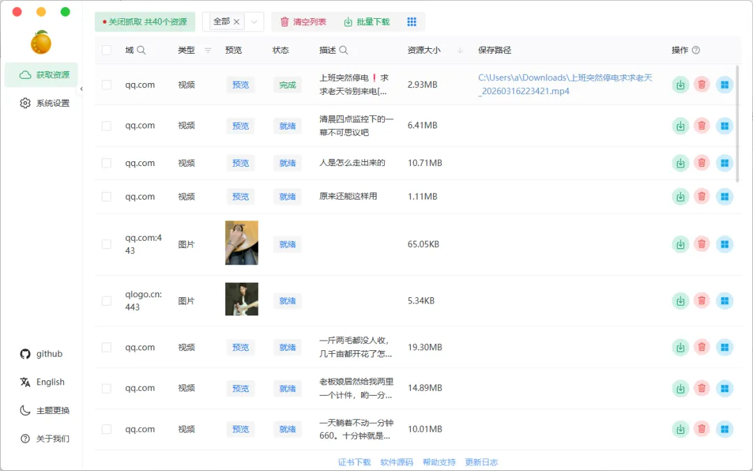 全能下载:不仅支持视频,音频、图片、m3u8 等网络资源也能一键捕获。