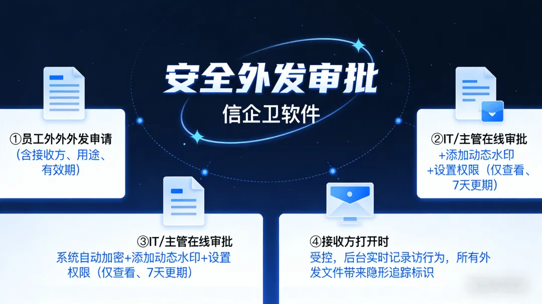 安全外发审批:外发文件需经审批,可绑定设备、设置有效期及打开次数,并自动添加动态水印防扩散。