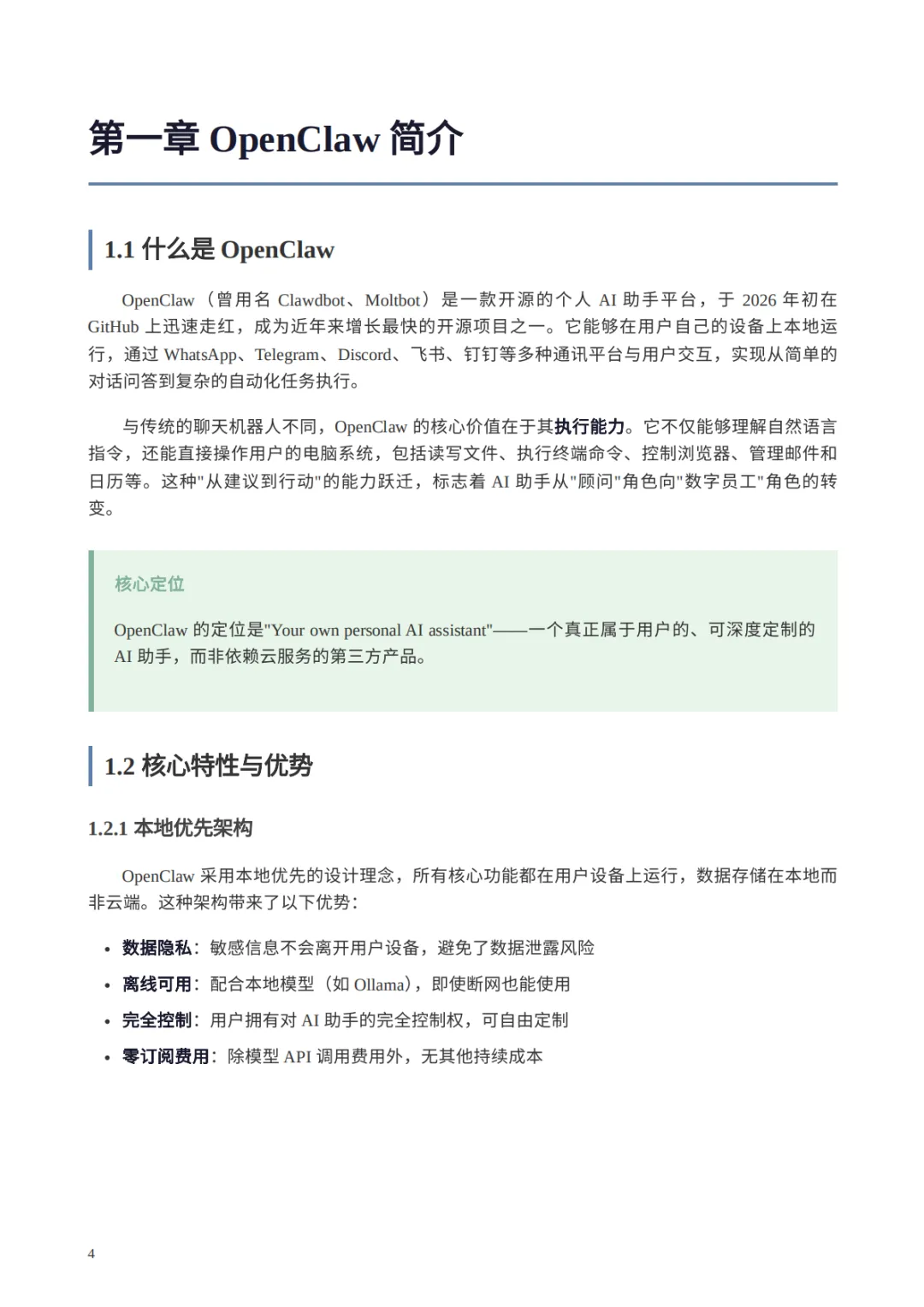 《OpenClaw完全使用手册》为我们详细呈现了一个在2026年初迅速崛起的、定位独特的开源项目——OpenClaw。以下将从多个维度对其进行深度剖析: