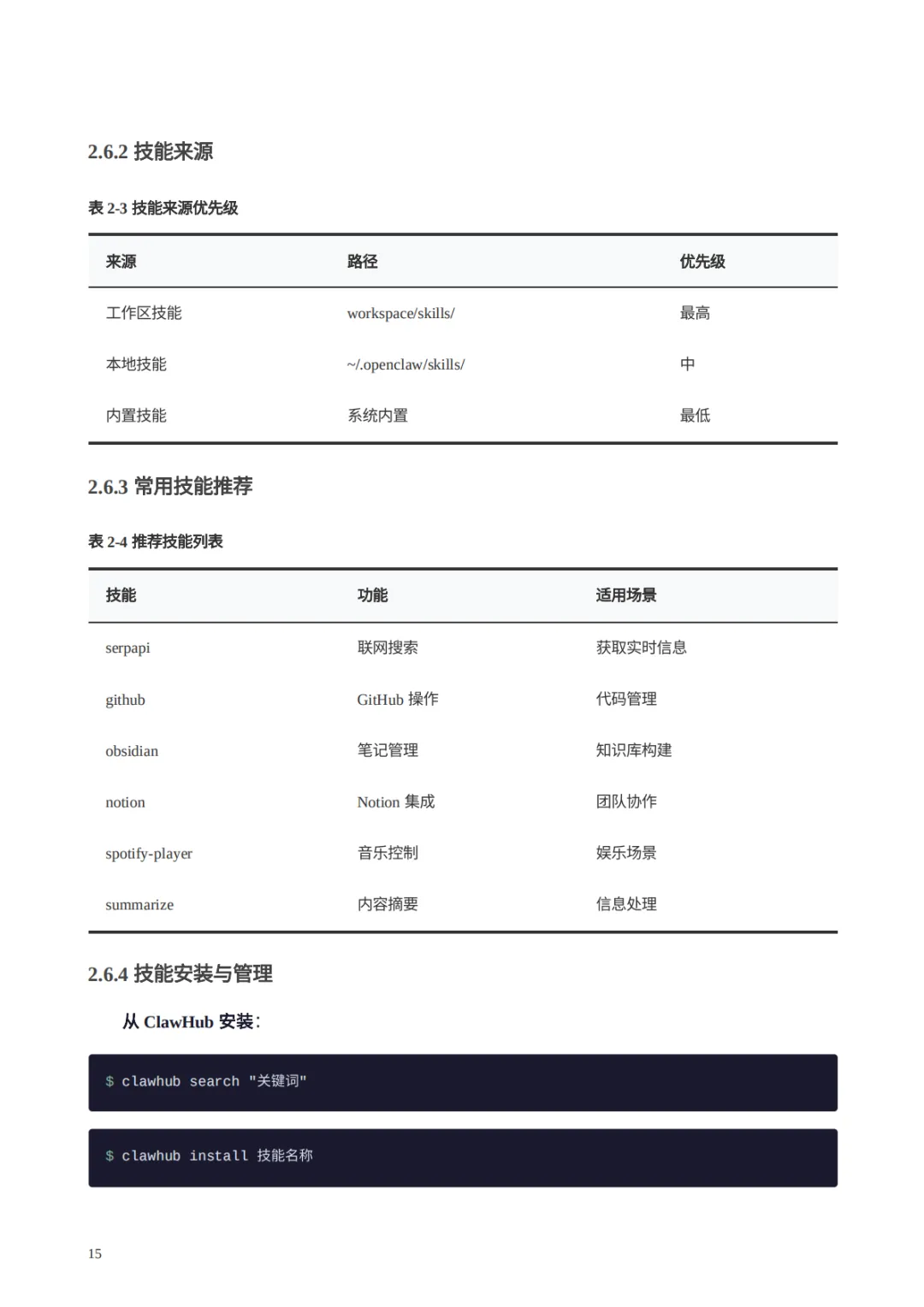 SKILL.md描述任务)极大降低了功能扩展的门槛,吸引了大量非技术用户贡献技能,形成了手册中提到的ClawHub(拥有3000+技能) 这一繁荣生态。这种“热重载”、遵循开放标准(AgentSkills)的设计,使其成为一个高度灵活和可进化的平台。 -