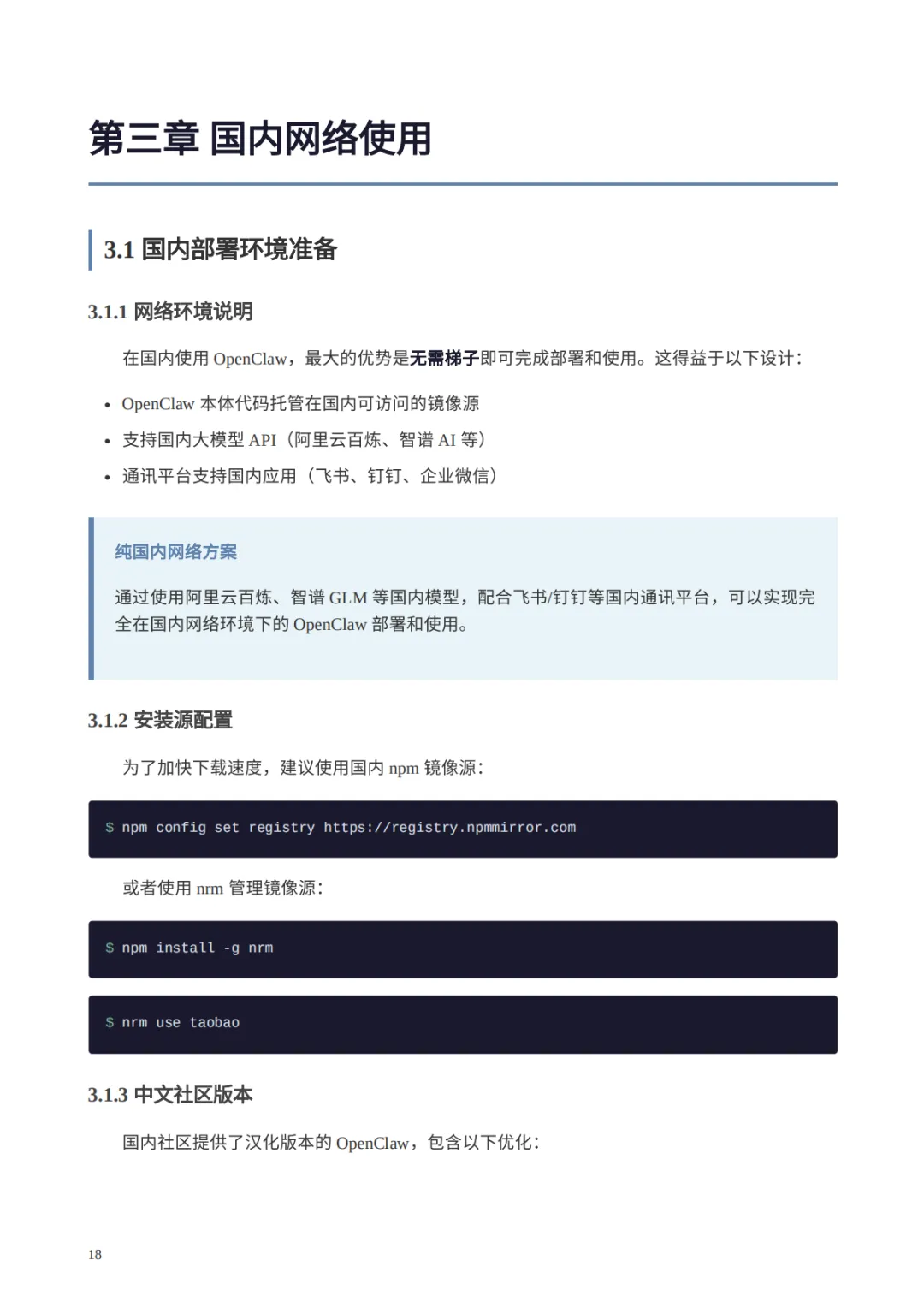 对国内环境的深度适配:手册用整整一章(第三章)详述“国内网络使用”,这显示了项目对中国市场的重视。它提供了纯国内网络方案: