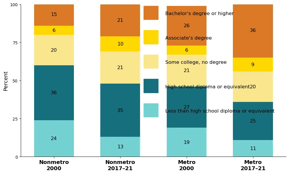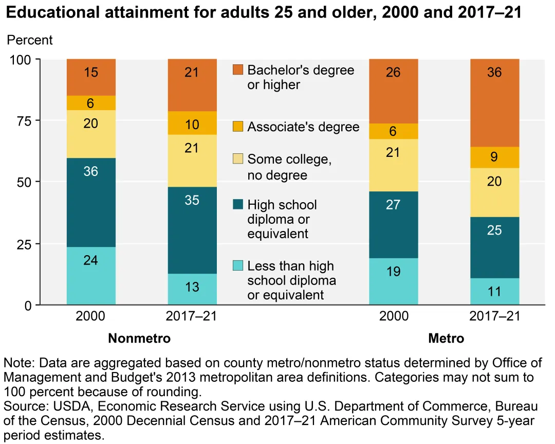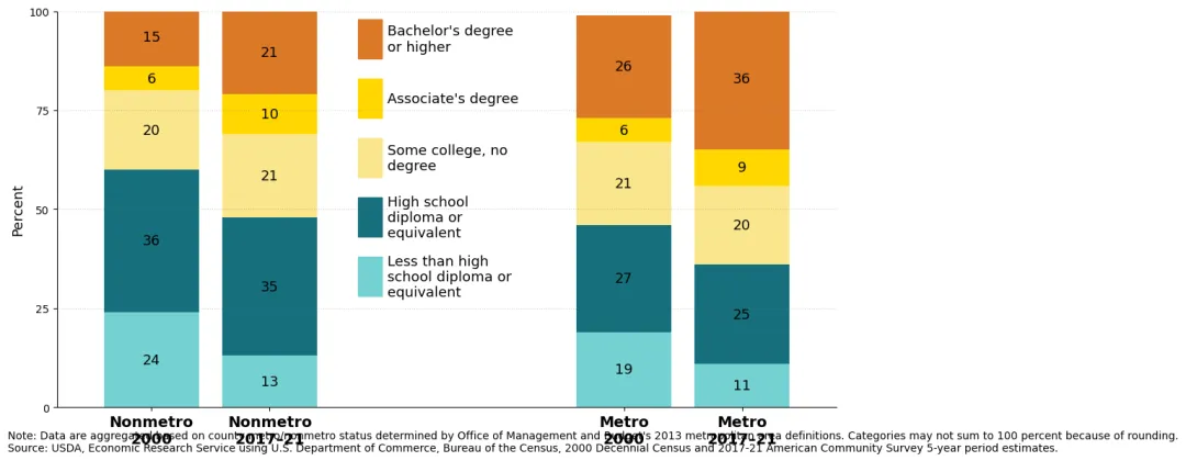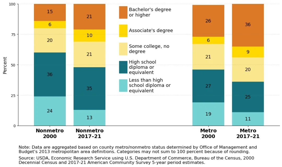 原图,Source: Nonmetro education levels are improving, but still lag metro