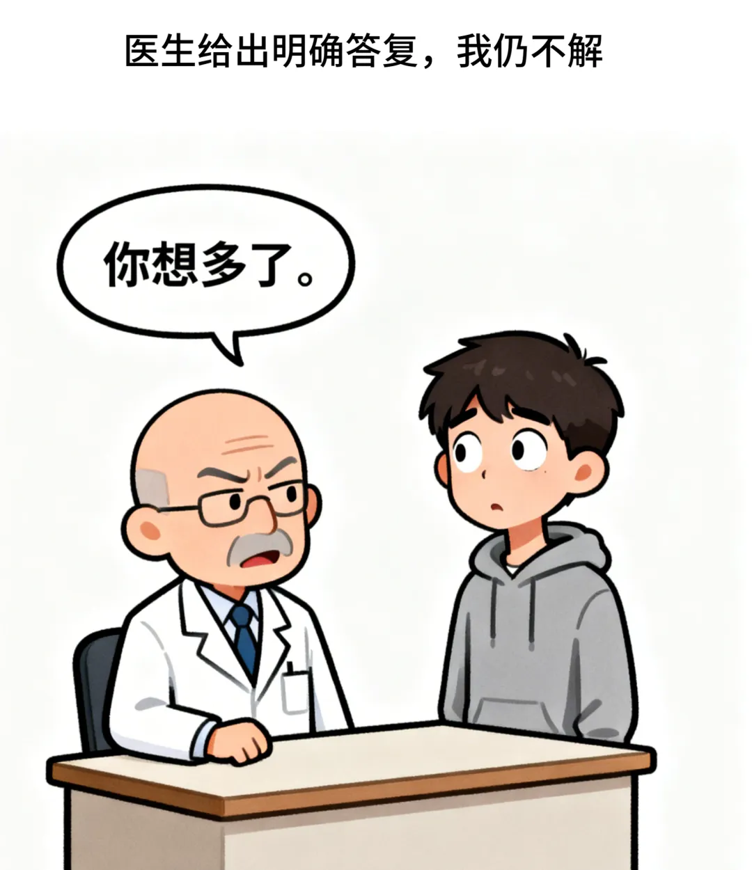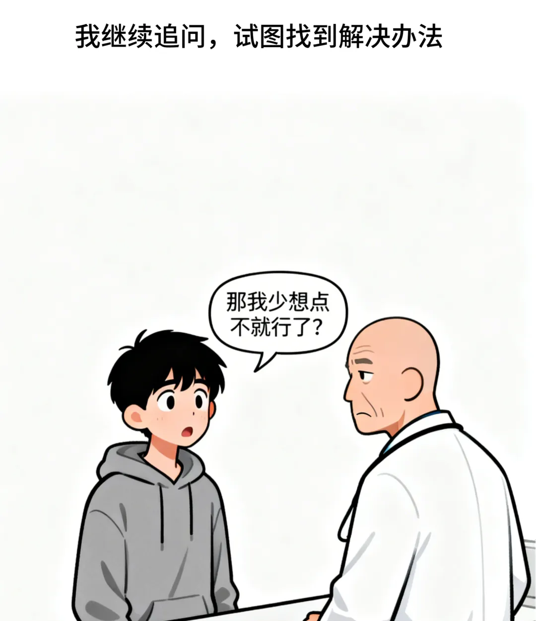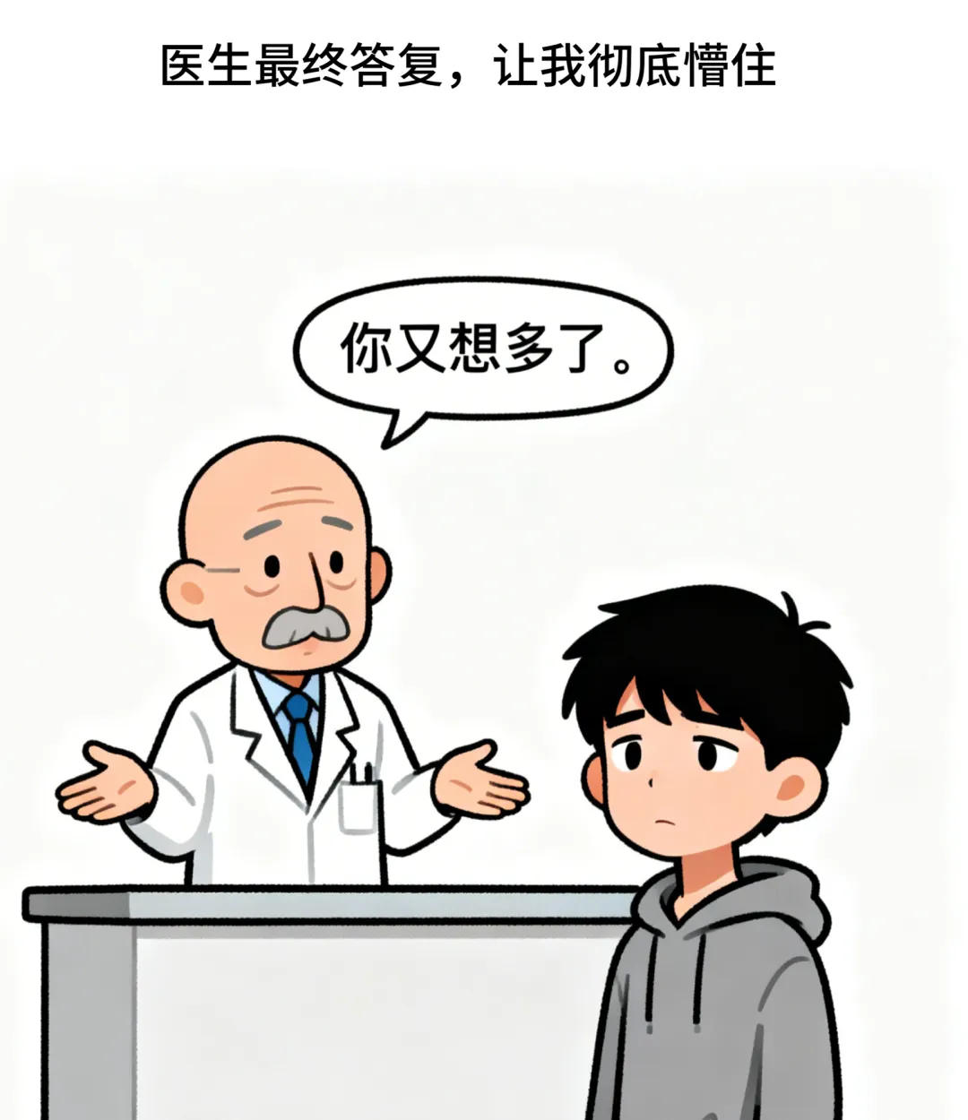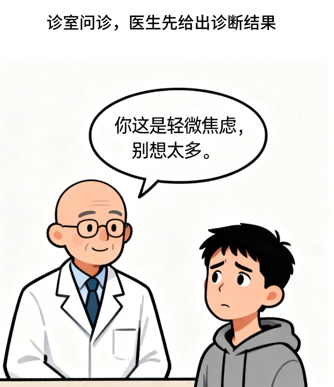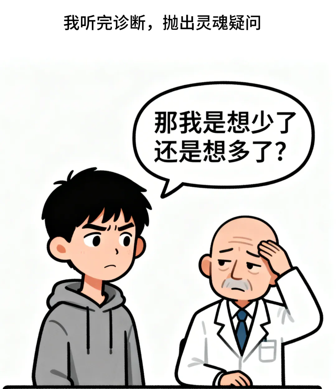 趣味漫画:医生:你这是轻微焦虑,别想太多.我:那我是想多了还是想少了?医生:你想多了.我:那我少想点?医生:你又想多了.