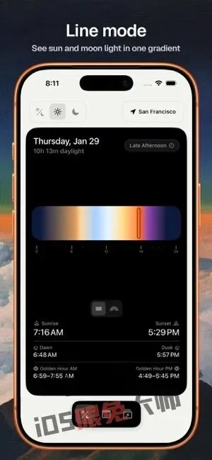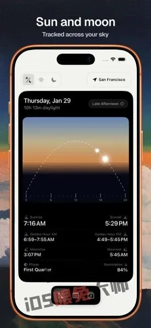 【Solar Arc – Sun & Moon Tracker】一款太阳和月亮追踪器,每个视角都随着真实天空的变化而变化——光线温暖时温暖,黑暗天空黑暗。