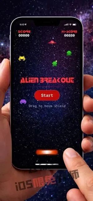 【Alien Breakout:手表游戏】一款能让你在Apple Watch、iPhone或iPad上畅玩经典打砖块的小游戏。通过滑动或数码表冠控制挡板接住小球,轻点开关音效,长按标题更可开启复古模式。