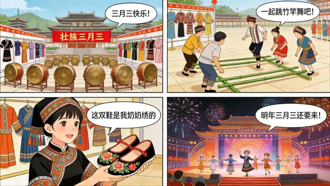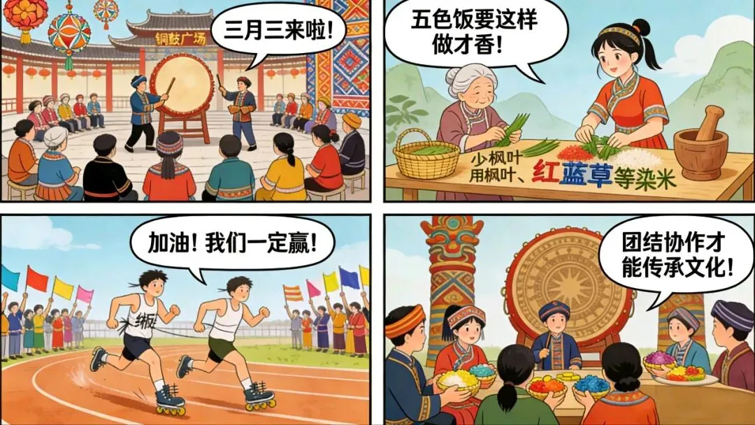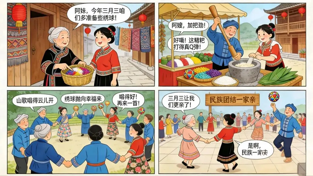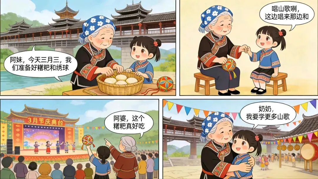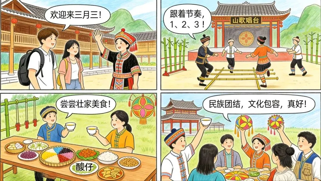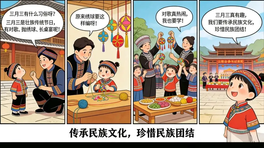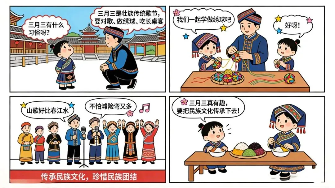 这些画作贴近手绘质感,画面简单却满是巧思,将抛绣球、唱山歌、品五色糯米饭、跳竹竿舞等经典三月三民俗,和亲子相伴、祖孙同乐、家校携手的温馨场景完美融合。没有繁复的线条,却藏着浓浓的民族情与家国情,既展现了广西三月三浓郁的民俗魅力,又紧扣学校“共筑民族情,同育时代人”的家庭教育理念。