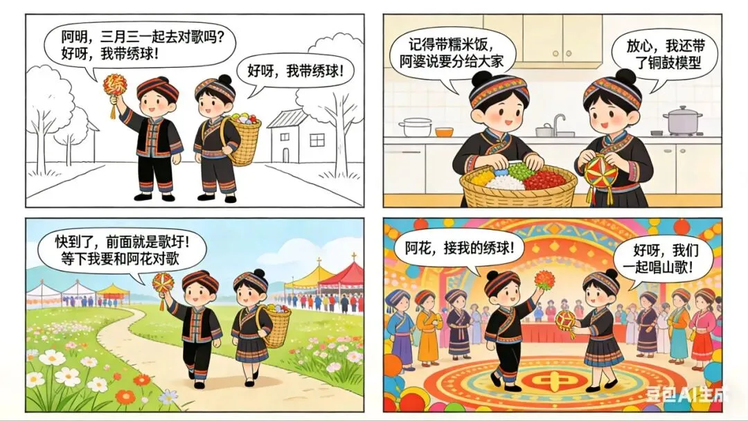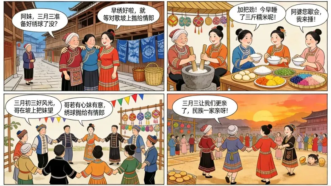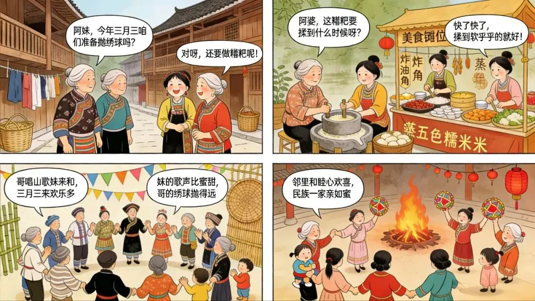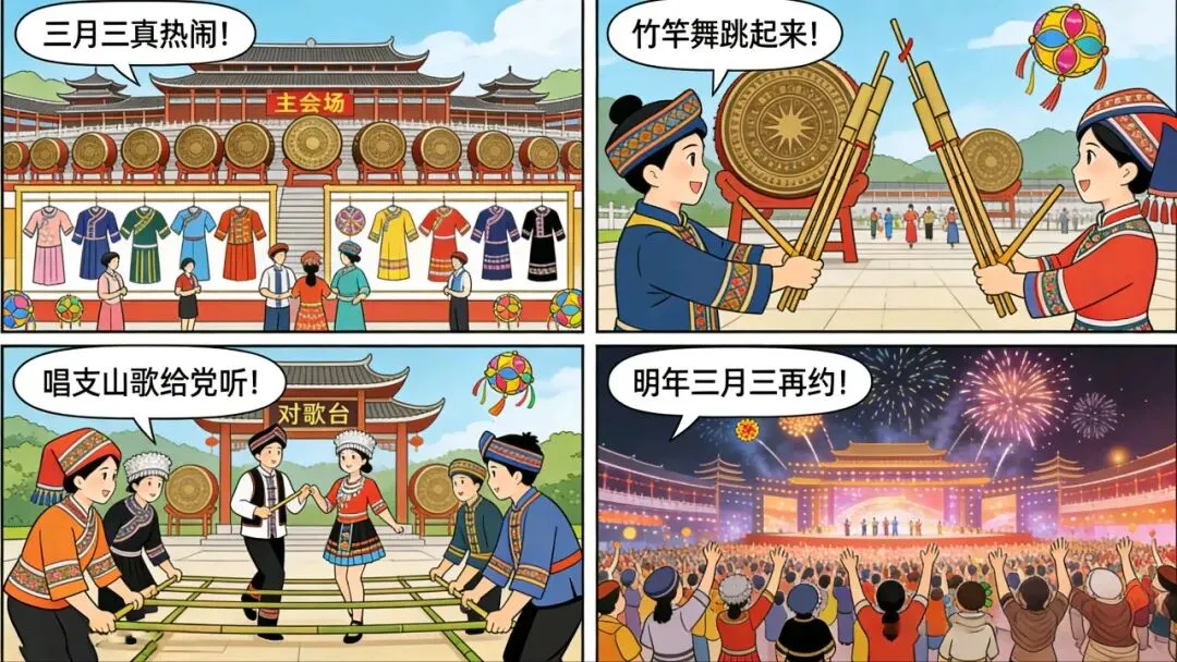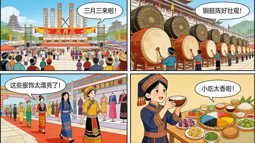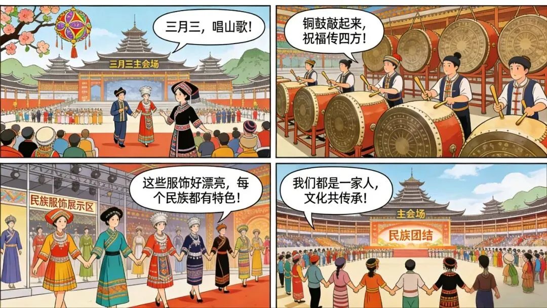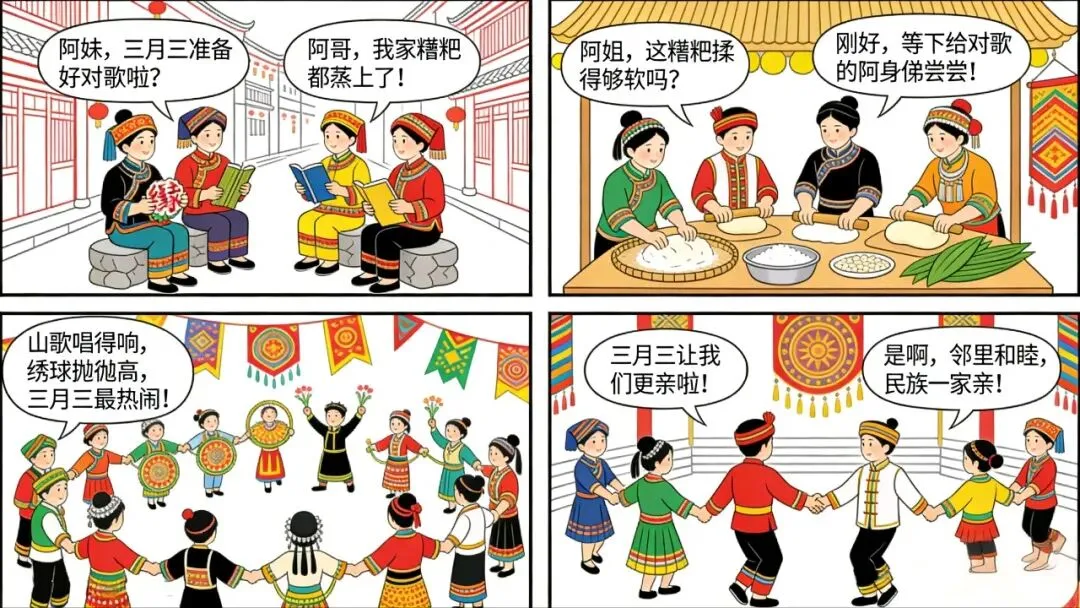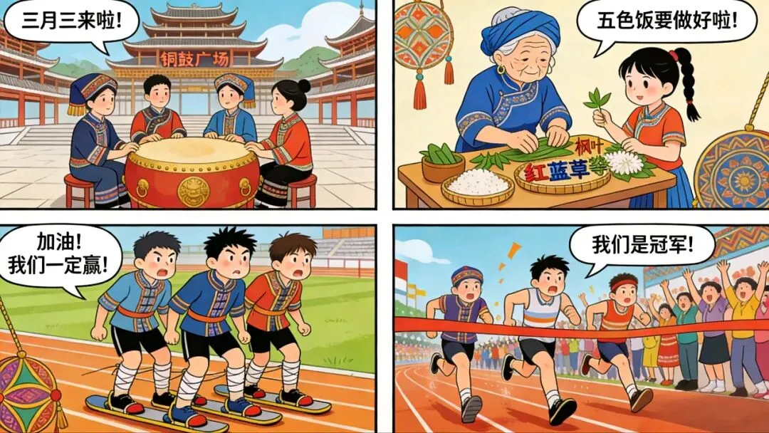 这些画作贴近手绘质感,画面简单却满是巧思,将抛绣球、唱山歌、品五色糯米饭、跳竹竿舞等经典三月三民俗,和亲子相伴、祖孙同乐、家校携手的温馨场景完美融合。没有繁复的线条,却藏着浓浓的民族情与家国情,既展现了广西三月三浓郁的民俗魅力,又紧扣学校“共筑民族情,同育时代人”的家庭教育理念。