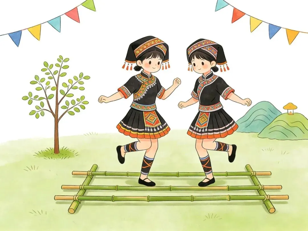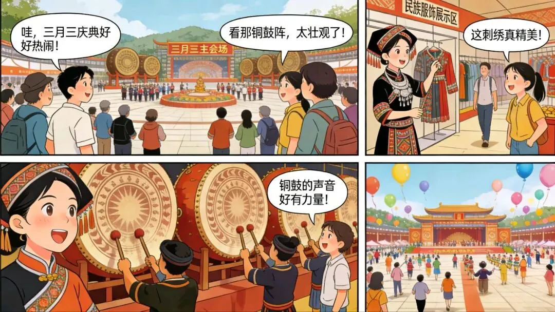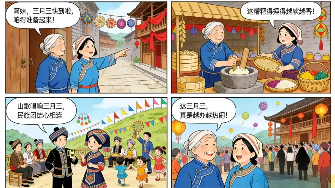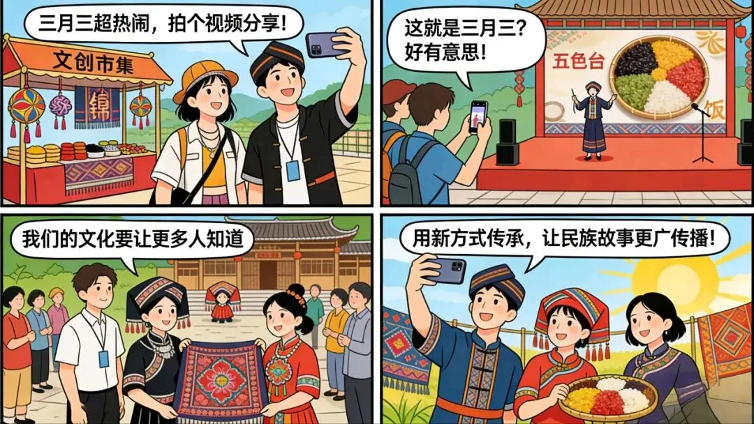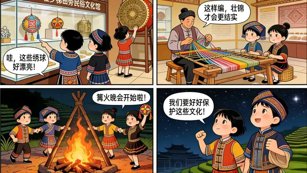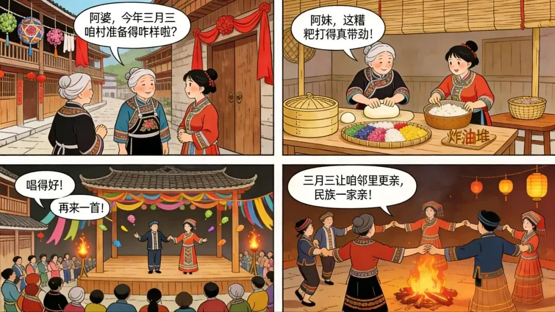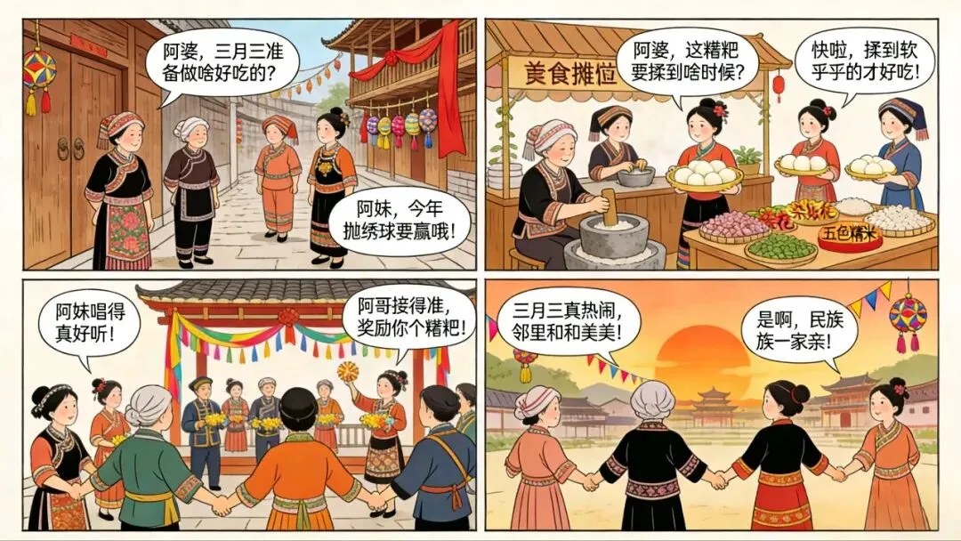 这些画作贴近手绘质感,画面简单却满是巧思,将抛绣球、唱山歌、品五色糯米饭、跳竹竿舞等经典三月三民俗,和亲子相伴、祖孙同乐、家校携手的温馨场景完美融合。没有繁复的线条,却藏着浓浓的民族情与家国情,既展现了广西三月三浓郁的民俗魅力,又紧扣学校“共筑民族情,同育时代人”的家庭教育理念。