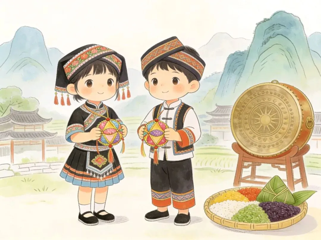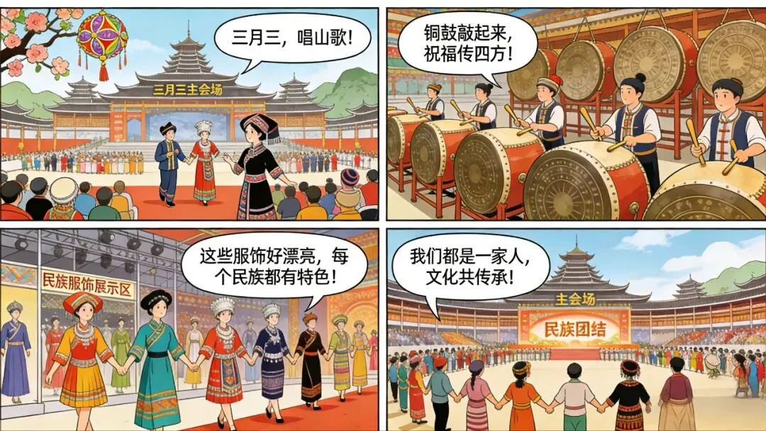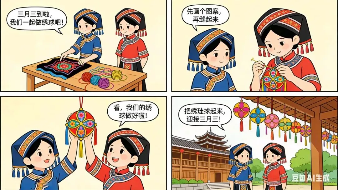 春风送暖,壮乡欢歌,广西三月三的民俗风情藏在笔墨之间,手绘绘画定格三月三美好瞬间,将特色民俗与家校共育、民族传承相融,每一幅都质朴又暖心,快来一起感受这份独属于壮乡的美好吧!