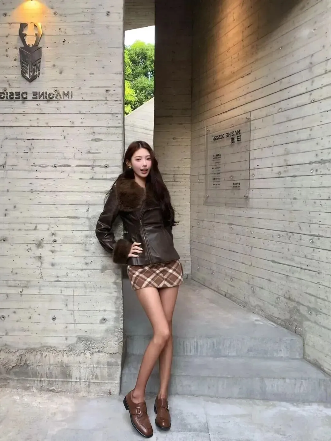 棕色深色皮衣与格纹短裙在一起出现的时候会产生一种刚柔相济、色彩对比强烈的化学反应。皮衣的帅气和裙子的甜美没有矛盾。毛绒领口、袖口加入温暖感,让她的秋风吹来,双臂一扬,笑得是那么的甜、飒,美得发亮!