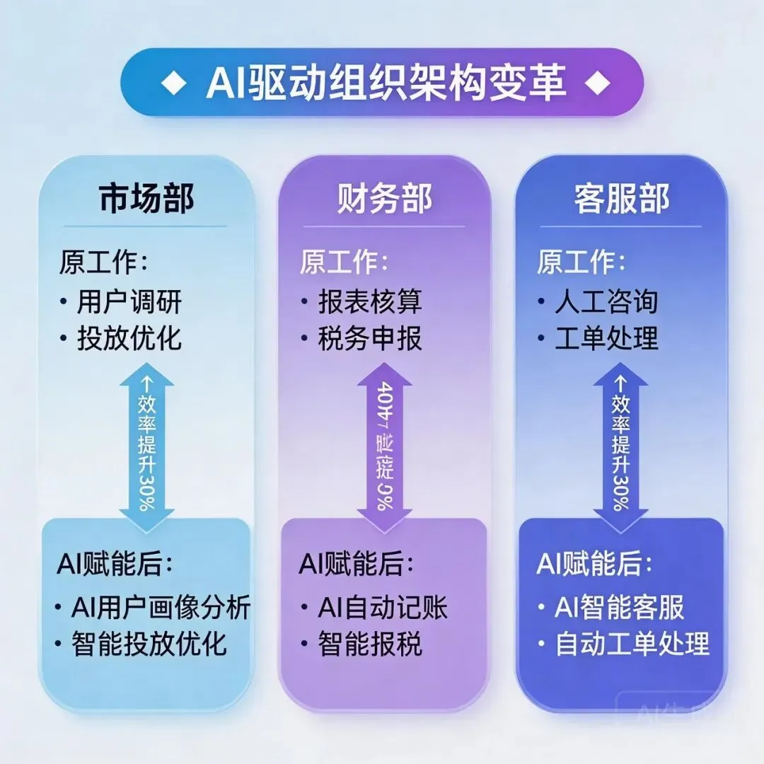 • 财务部:AI自动对账、生成报表、发现异常,会计师转型”财务策略师”