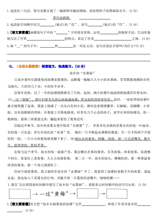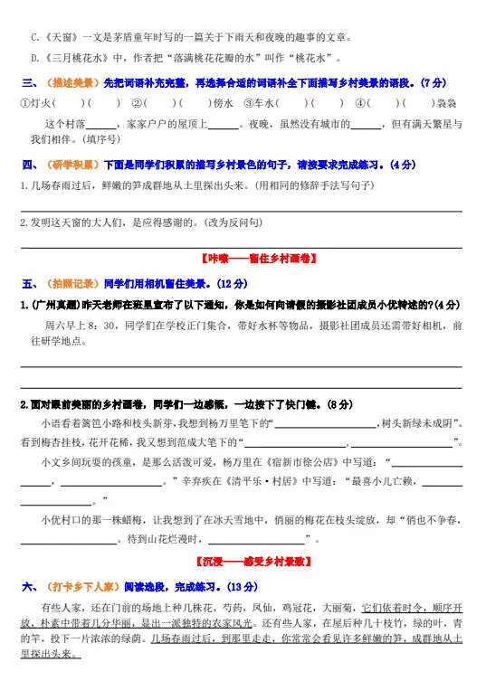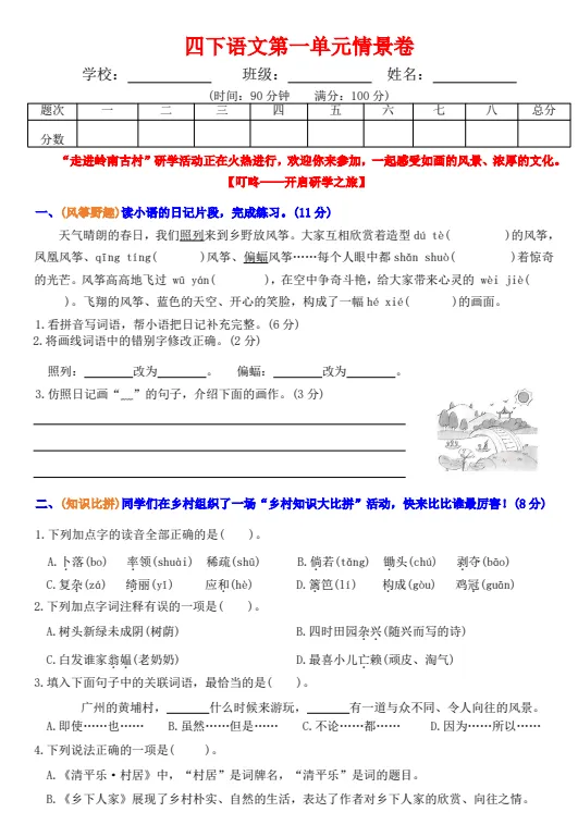 四下丨语文 第一单元情景卷+答案/电子版可下载