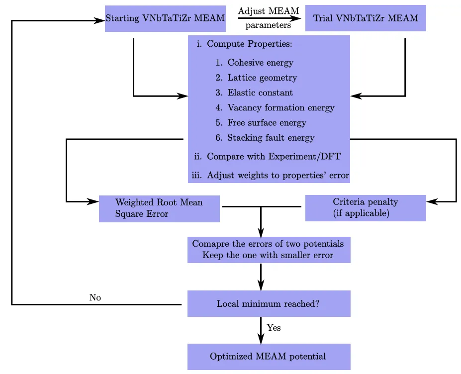 这篇发表在 COMMAT 上的工作,正是围绕这一问题展开。文章指出,尽管第一性原理计算能够较准确地描述材料性质,但其可处理的时间和空间尺度有限,难以直接用于研究复杂合金中的位错运动、层错行为及塑性变形过程。为此,作者针对 VNbTaTiZr 体系开发了一套新的 second nearest-neighbor Modified Embedded Atom Method (2NN-MEAM) 势函数,以期在保留较好精度的基础上,为更大尺度的原子模拟提供可靠工具。
