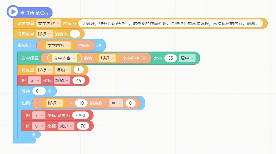 含义:这就像是在给电脑“布置作业”。我们把一段长长的介绍文字存进一个叫“文字内容”的小盒子里,后面程序要用到的文字就从这里拿。