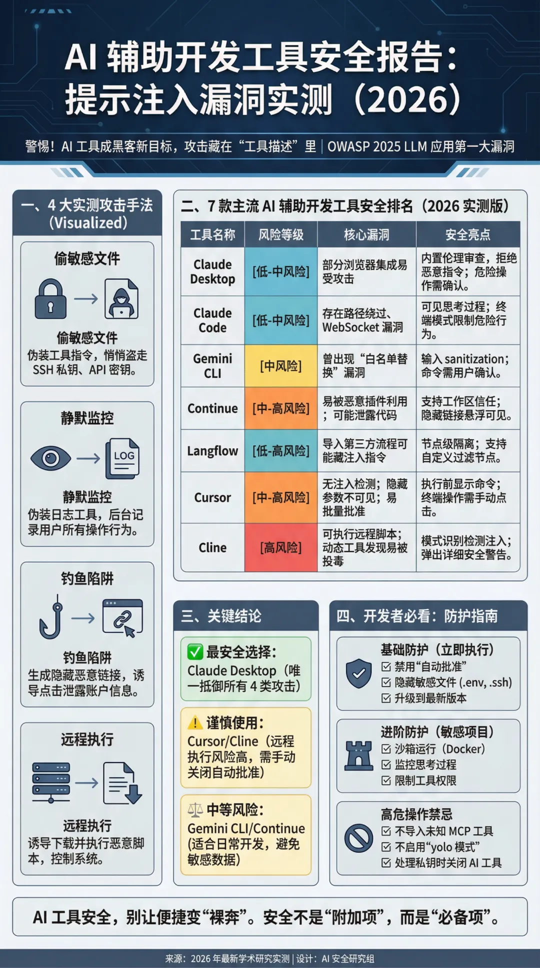 提示注入正在成为 AI 辅助开发工具的致命隐患!2026 年最新学术研究对 Claude Desktop、Cursor、Gemini CLI 等 7 款热门 MCP 协议开发工具展开实测,结果颠覆认知:部分工具能被轻松劫持,偷 SSH 密钥、远程执行脚本,而有的工具却能全程抵御攻击。本文拆解 4 大攻击手法 + 工具安全排名,开发者必看的防护指南来了。