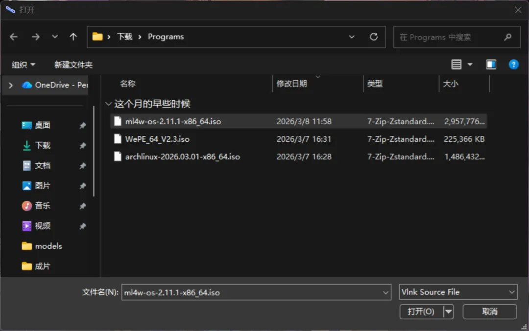 这里我们点击创建,就会弹出弹窗,我们选择本地的iso镜像存放的位置。比如这里我想要为ml4w(一个archlinux的dotfile hyprland前端整合包)创建一个vlnk,我们就选中它,然后点击打开或者按下enter回车。