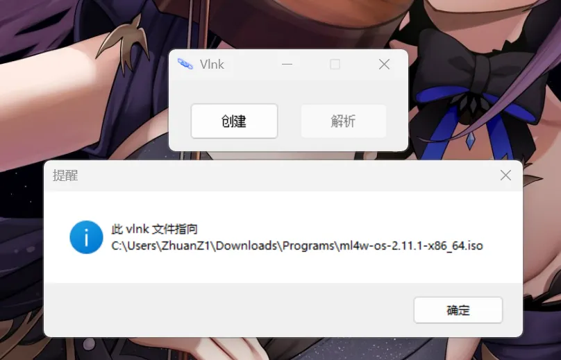 如果我们忘记了一个vlnk文件是指向哪个文件的,我们就一个点击右侧的“解析”按钮,然后选择一个vlnk文件,就会弹出一个弹窗,告诉你这个vlnk文件是指向什么镜像的。