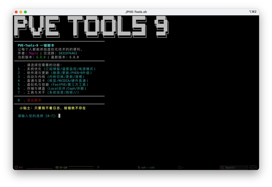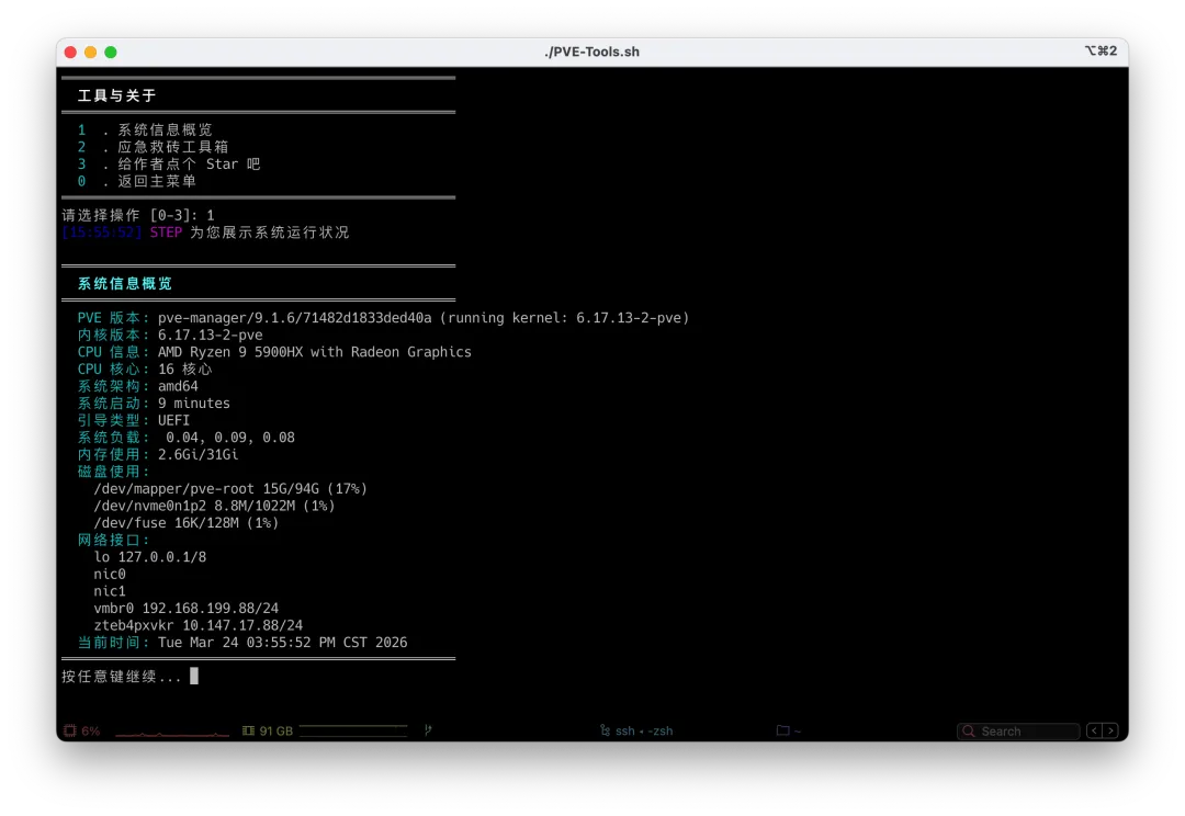 这款工具的核心价值在于:将原本需要查阅大量文档、手动输入复杂命令才能完成的PVE配置工作,转化为一目了然的交互式菜单操作。 即使你不是Linux专家,也能轻松完成专业级的系统配置。