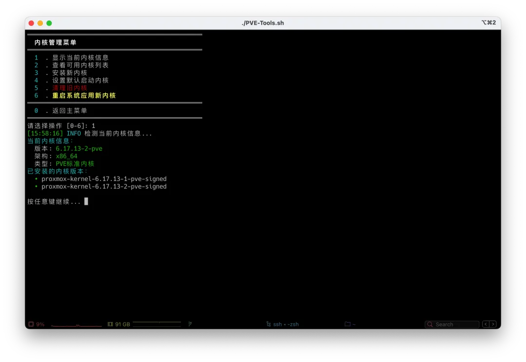 PVE内核的更新关系到系统稳定性和新硬件支持。PVE-Tools 9提供完整的内核管理功能: