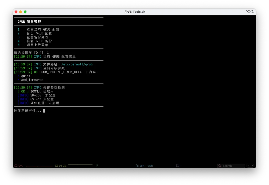 对于需要自定义内核参数的场景(如开启IOMMU),PVE-Tools 9提供了安全的GRUB管理方案: